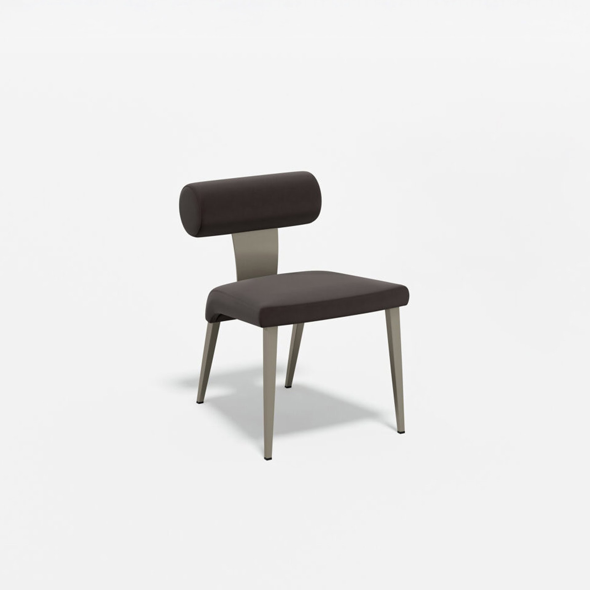 Designed by Carl Muller, the Bolo Dining Chair makes a bold modern statement through the balance of sculptural form and plush comfort. Its standout feature—a cylindrical, generously padded backrest—offers unexpected ergonomic support while serving as a striking visual anchor. The sleek, tapered steel legs form a grounded base with an athletic stance, while a curved steel arc joins the chair’s elements with architectural grace. The reverse waterfall seat cushion adds an additional layer of softness, creating a dining chair that’s as inviting as it is artful.