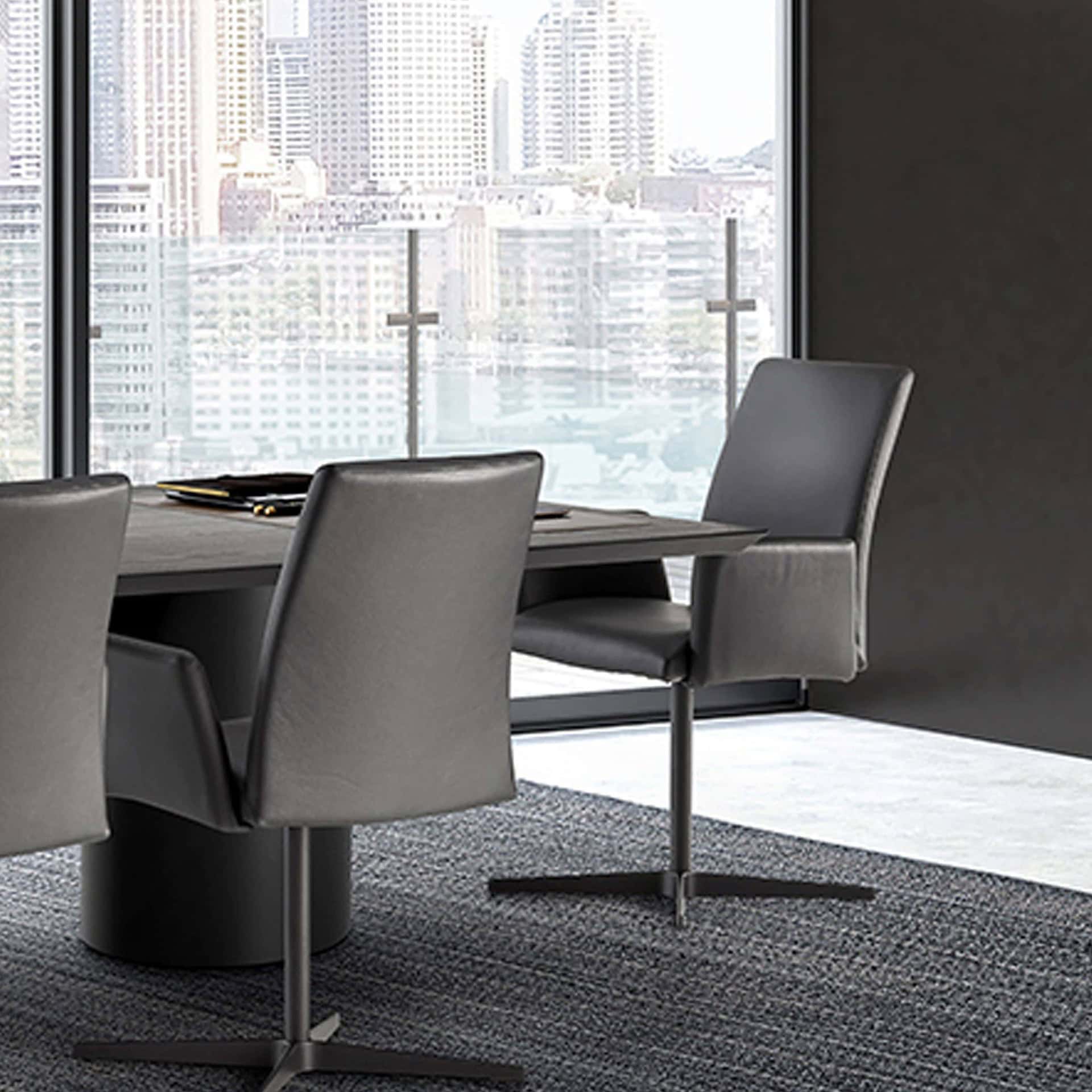 The Ekta Four Ways Chair is an upholstered chair and armchair with a rigorous and clean design, with a swivel, painted or polished aluminum base four ways. The slightly curved back and deep seat mold to your body to provide comfort for hours, ideal for work environments. Available in leather, eco-leather, or fabric. The cover cannot be removed.