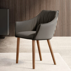 Introducing the luxurious, contemporary, upholstered Era Wood Legs Chair. Every component of the seat exhibits a sartorial touch, including the rich movement of wrinkles that adorn the cover in the inner part of the back. This chair features beautiful ash-stained solid wooden legs. Offered in fabric, eco-leather, or leather. The cover cannot be removed.