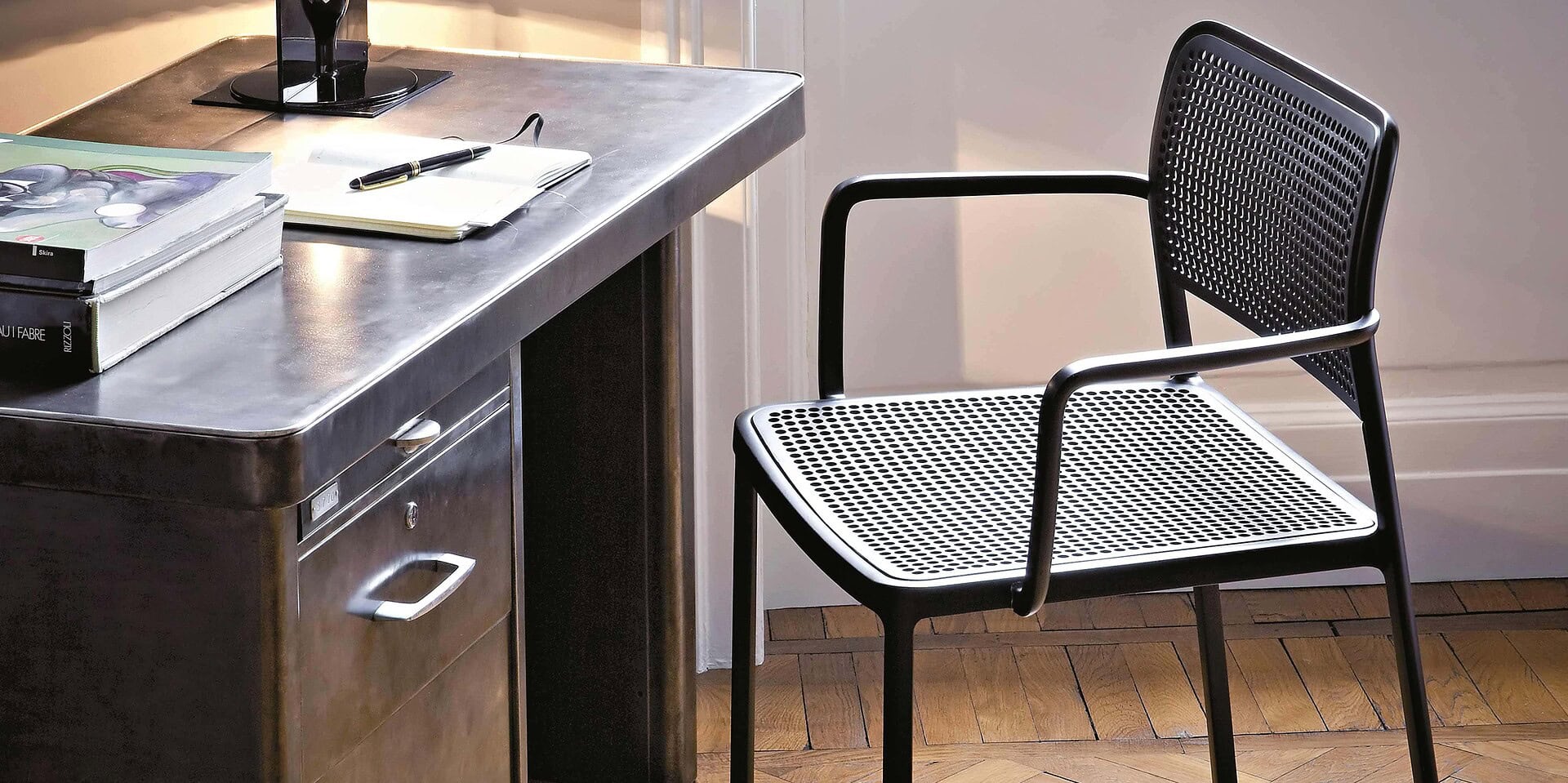 The Kartell Audrey Armchair designed by Piero Lissoni is modern and versatile. Because of its simple lines made using a die-casting process, it is composed of only two parts.