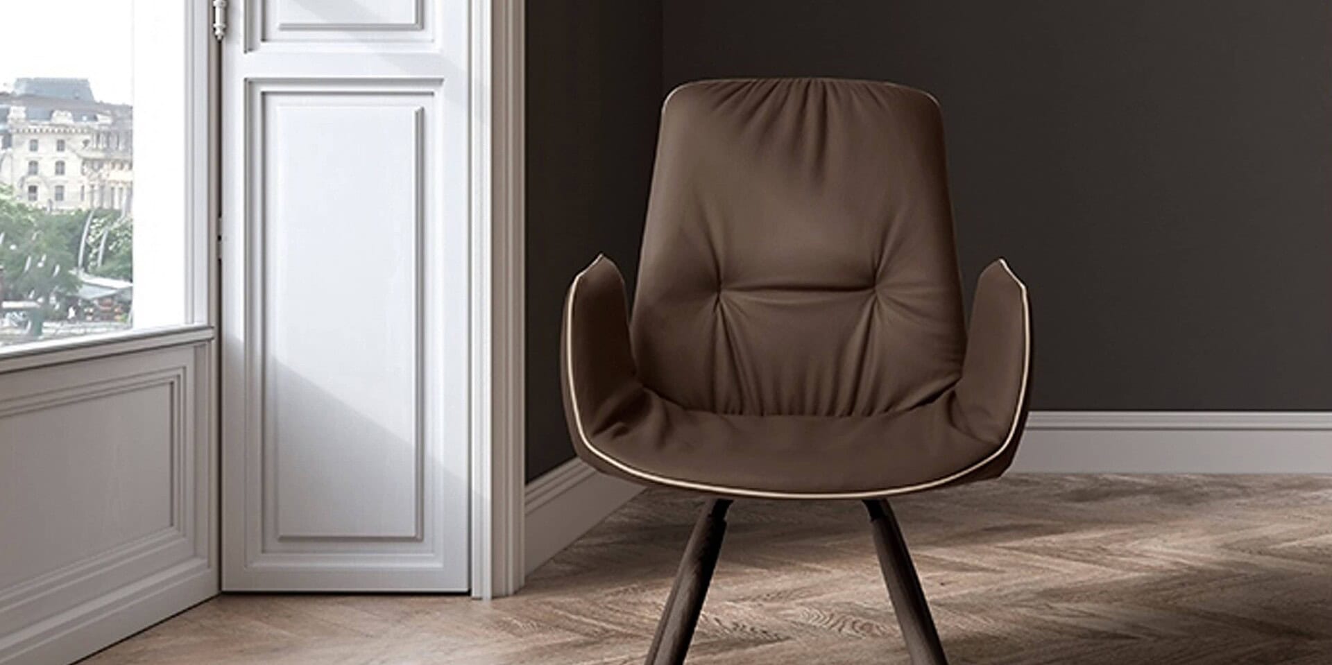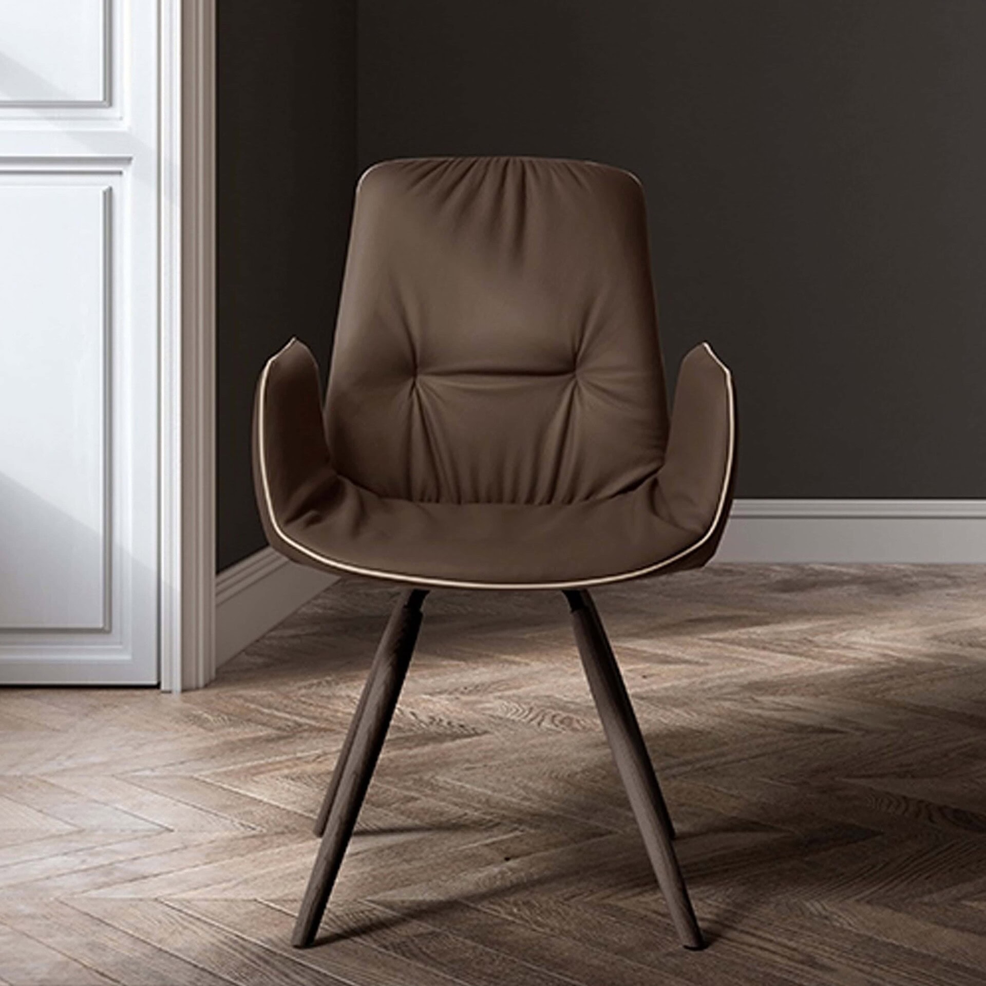 The Lisa Wood Trestle Chair seamlessly combines comfort and style. The eye-catching design features a combination of welcoming curves and sharp angles that complement one another. This dining chair features upholstery with ash-stained solid wooden legs. It's available for customization in leather, eco-leather, or fabric. The cover is not removable.