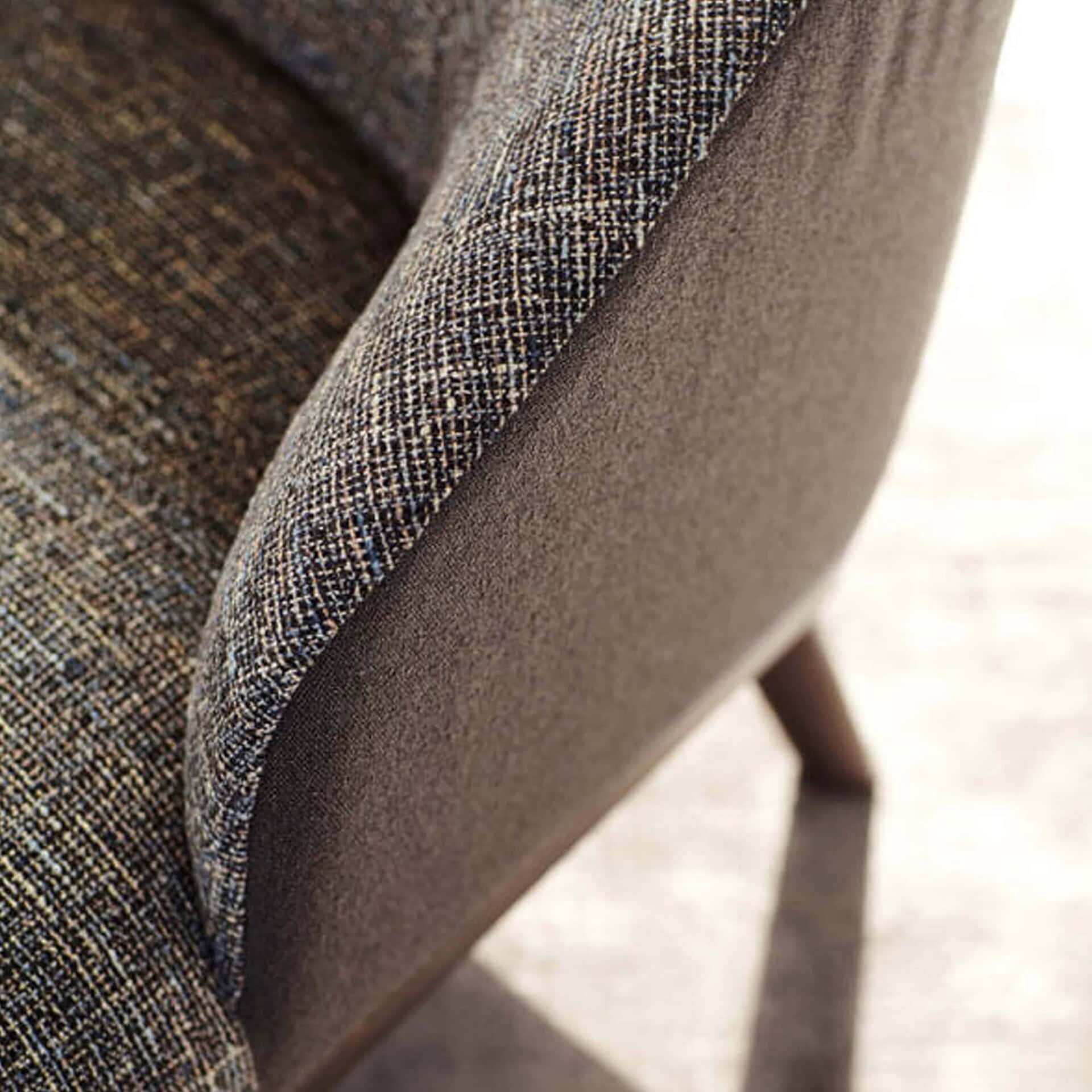 Constructed from a sturdy structure of solid fir wood and multilayer E1-class panels, the armchair is reinforced with crossed elastic webbing in the seat and a plywood back for lasting durability. Available in full fabric, artificial leather, or a two-tone mix of the two, this armchair offers exceptional versatility. The mix version features the seat and inner backrest in fabric with the outer back in leather, allowing for expressive combinations. Its solid ash wood base comes in either Eucalyptus or Grey wood finishes, with standard feet height at 18–20 cm.