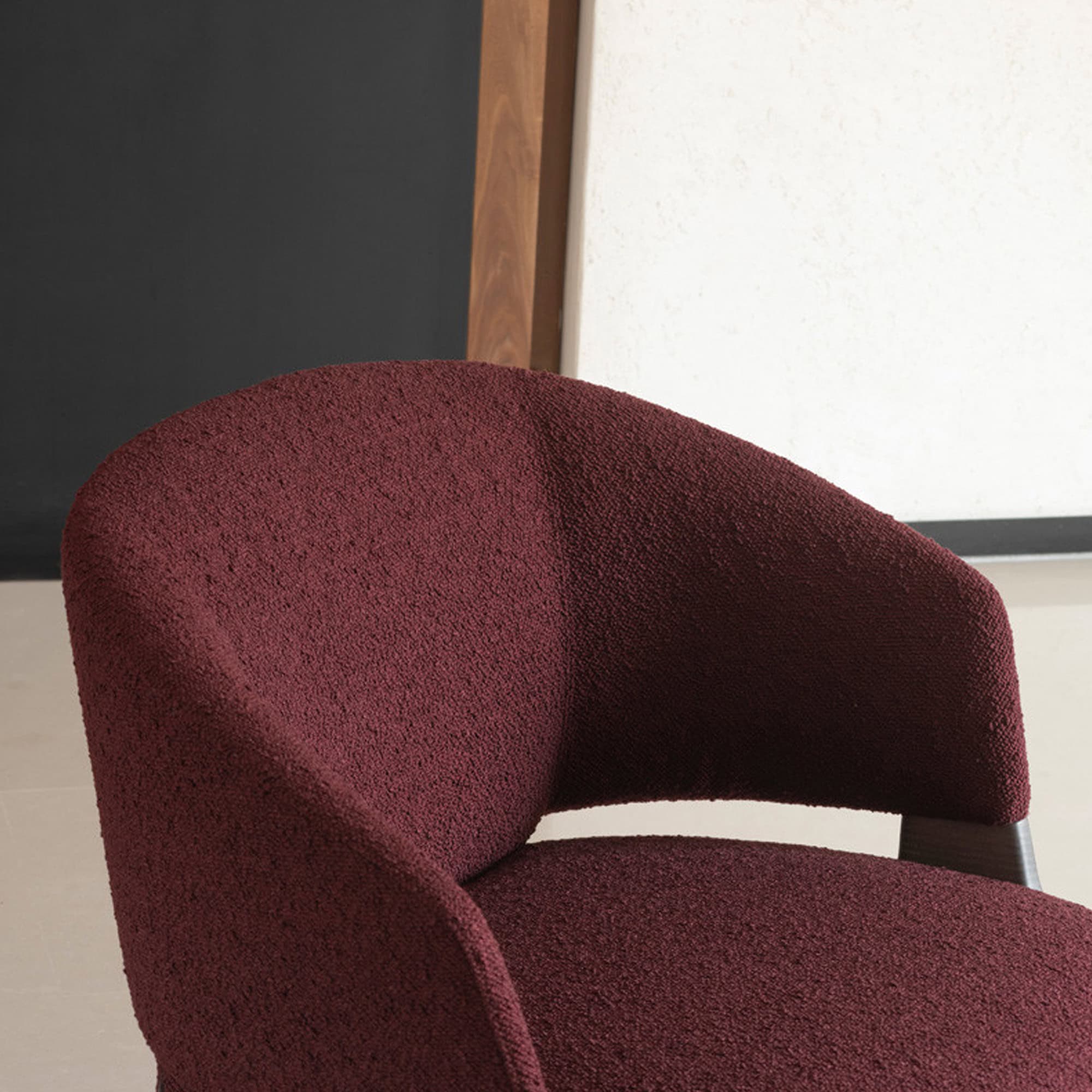 The Velis armchair features padded seating in fire-retardant polyurethane foam for lasting support. Solid ash wood or Canaletto walnut details accent the base and armrests, highlighting where structure meets softness. With its compact proportions and thoughtful materials, Velis elevates any interior with its tailored, modern aesthetic.