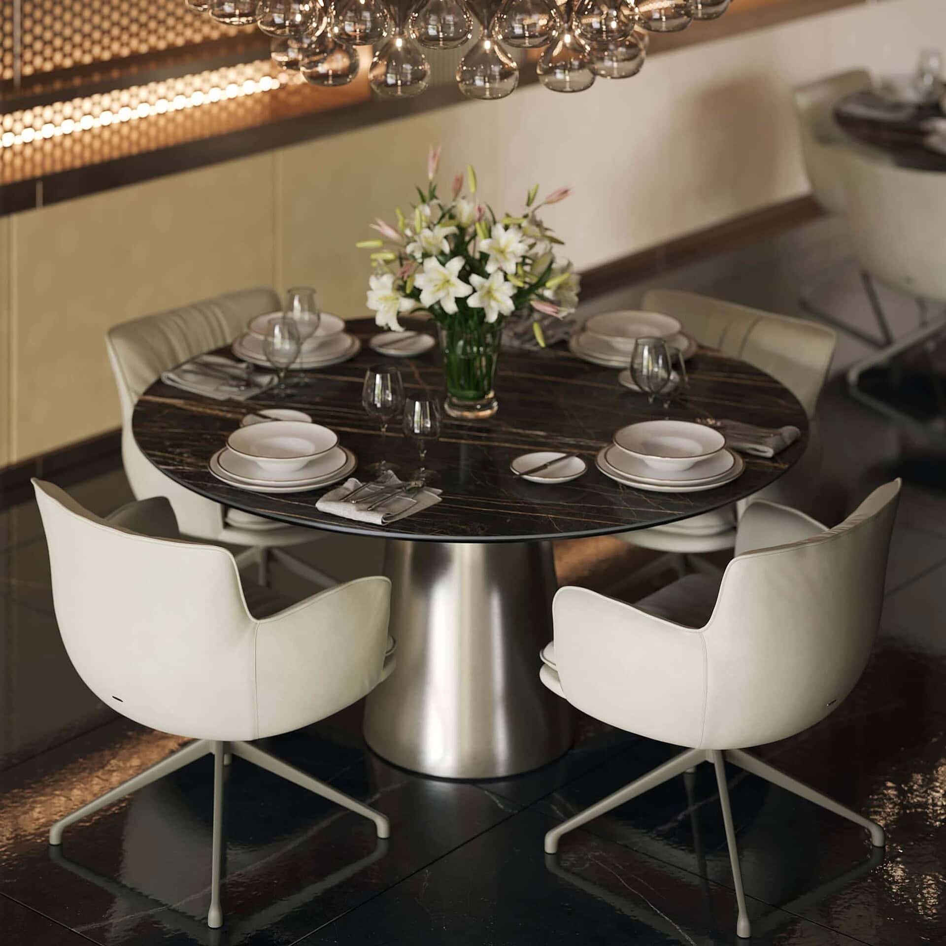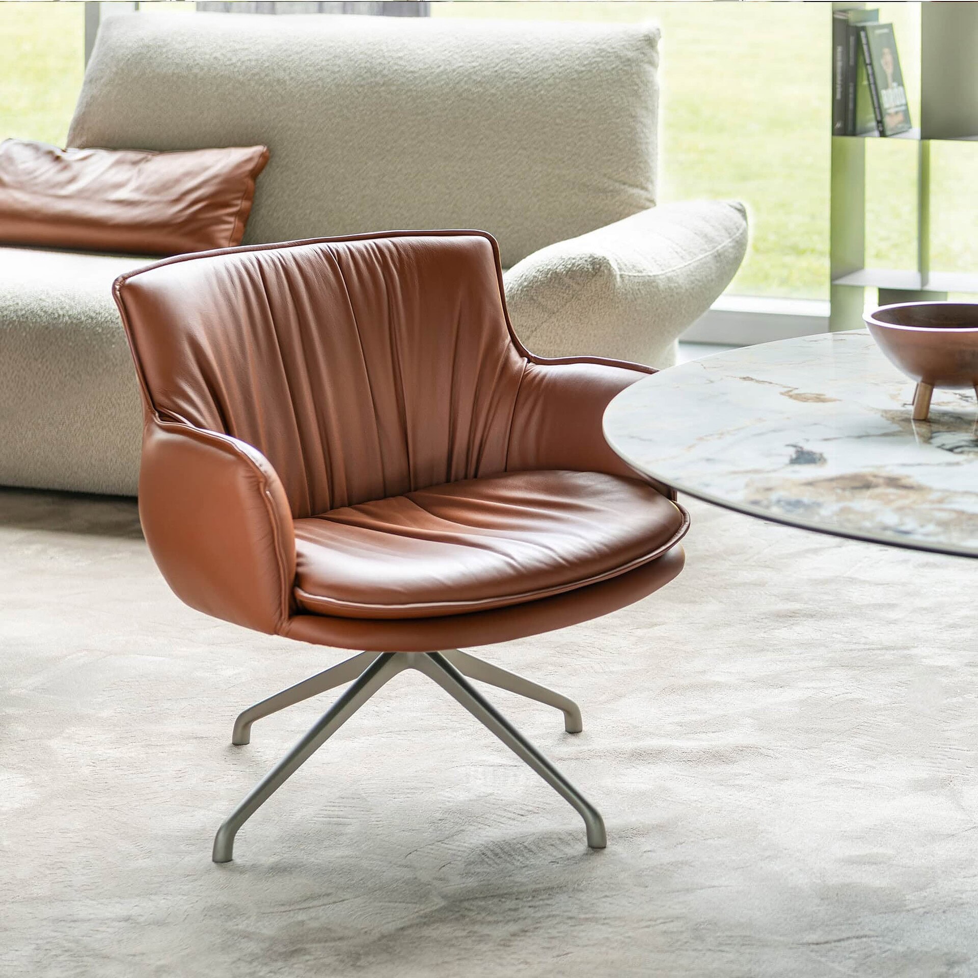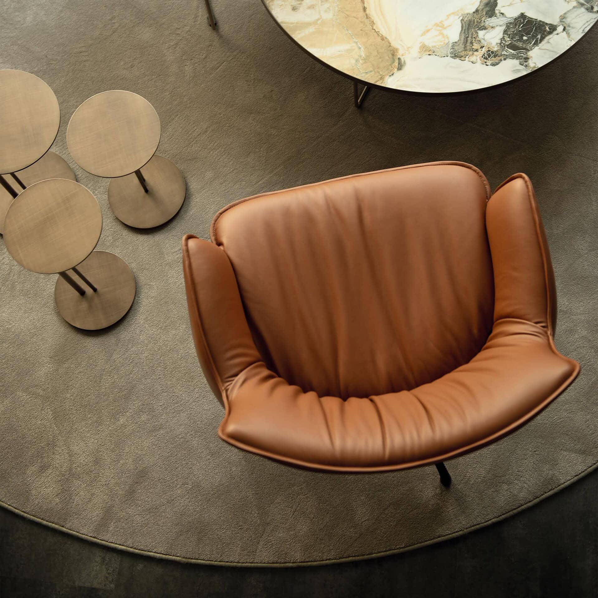 The Rhonda Lounge Chair is a refined evolution of comfort and form—an elegant swivel armchair that pairs sculptural curves with inviting softness. Its generously rounded seat and enveloping backrest offer a sense of ease and sophistication, while the sleek swivel base provides fluid motion and a contemporary touch. Designed to stand out yet harmonize effortlessly, the Rhonda Lounge fits seamlessly into both refined and relaxed interiors.