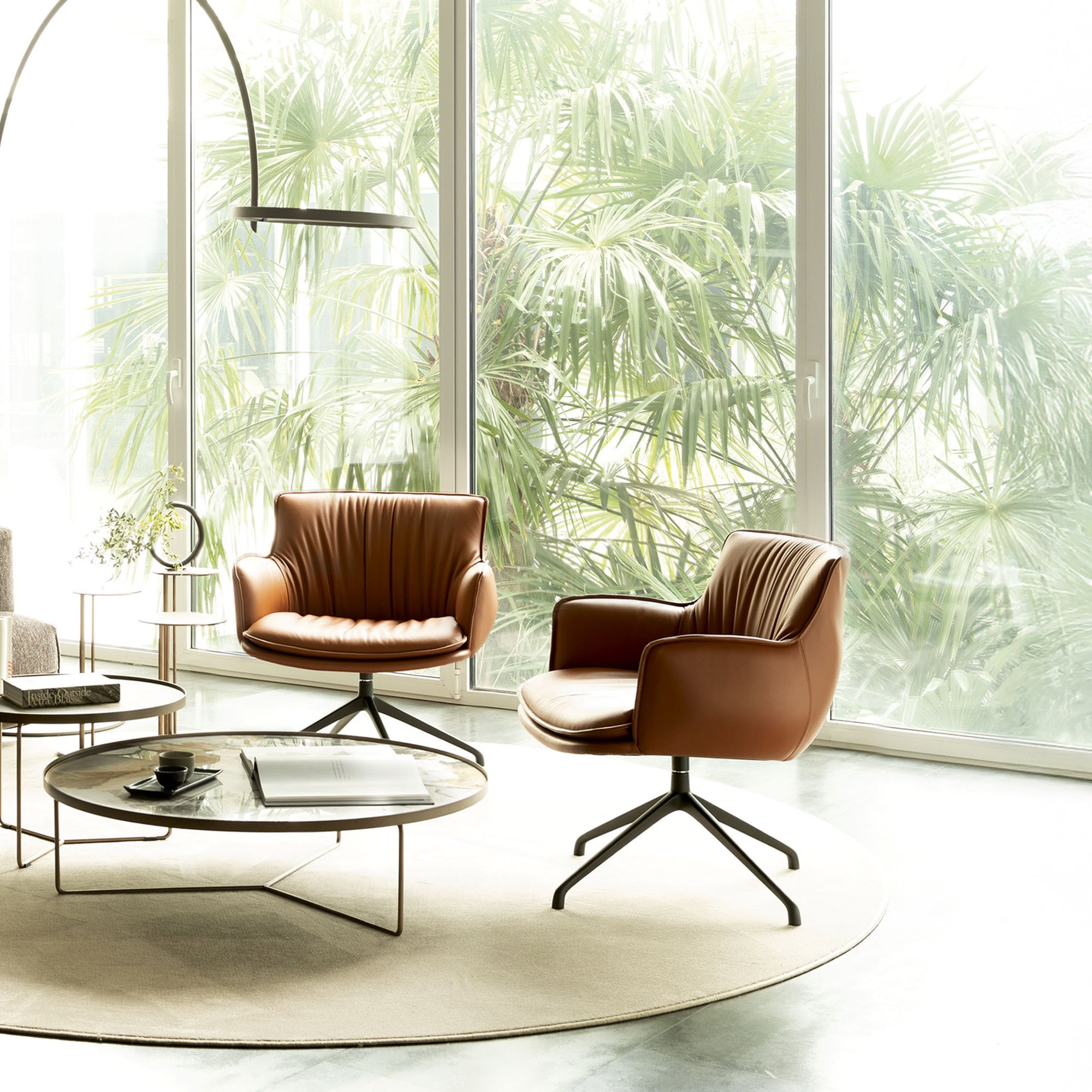 The Rhonda Lounge Chair is a refined evolution of comfort and form—an elegant swivel armchair that pairs sculptural curves with inviting softness. Its generously rounded seat and enveloping backrest offer a sense of ease and sophistication, while the sleek swivel base provides fluid motion and a contemporary touch. Designed to stand out yet harmonize effortlessly, the Rhonda Lounge fits seamlessly into both refined and relaxed interiors.