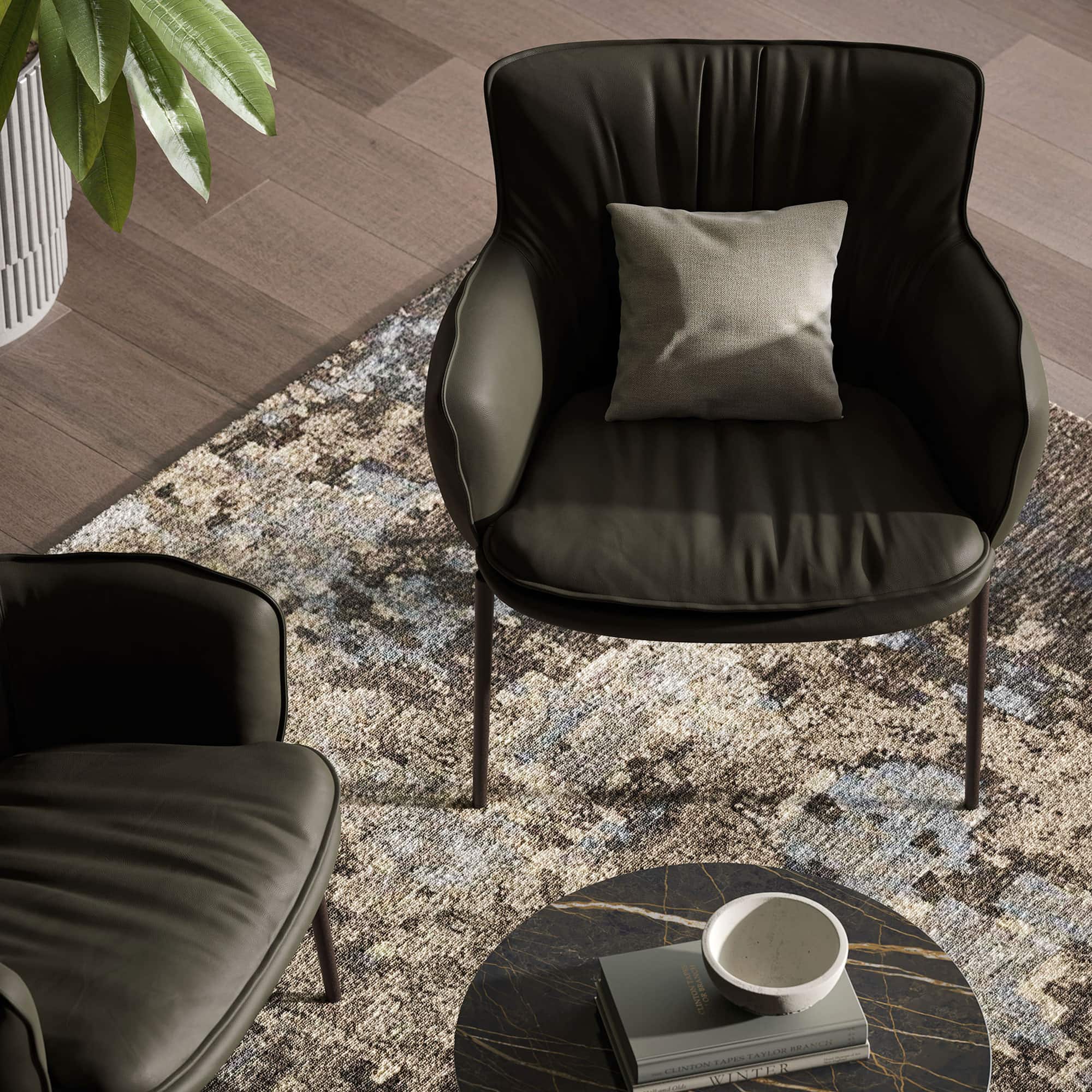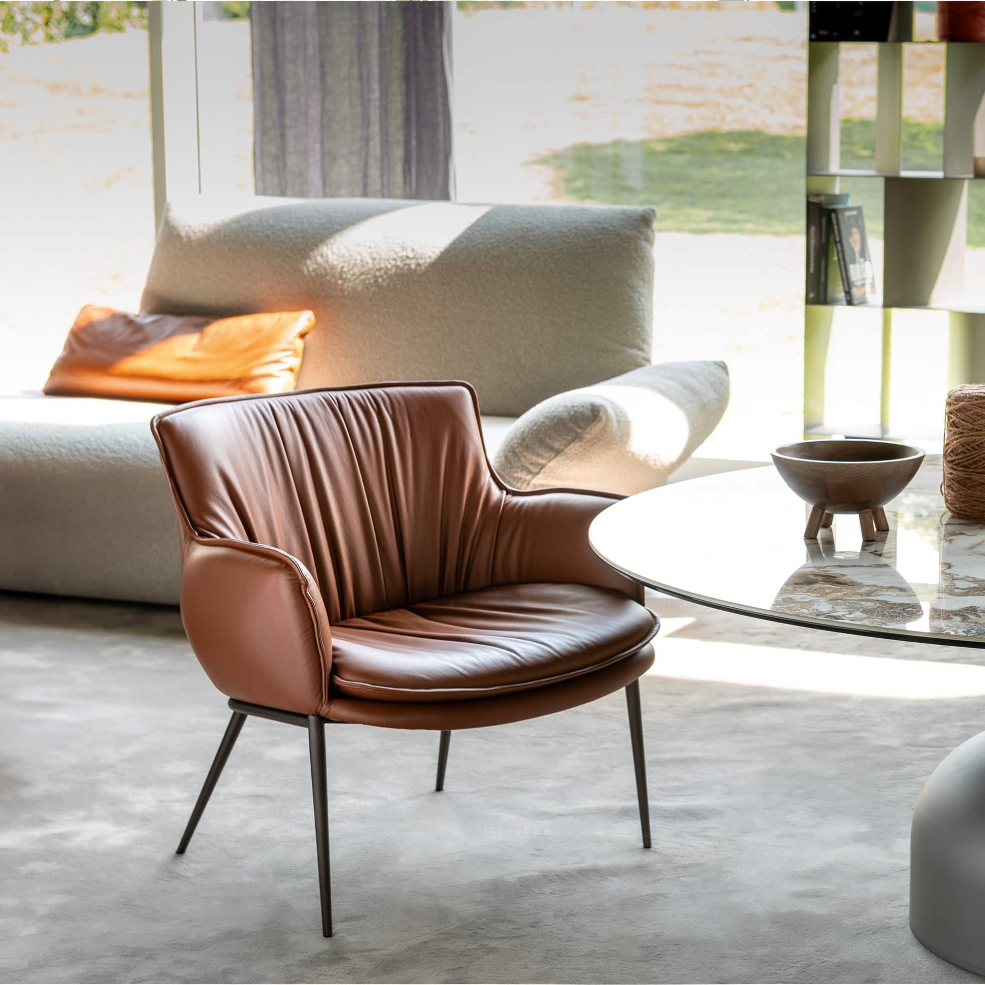 The Rhonda Lounge Chair is available in an extensive palette of upholstery colors—from soft neutrals like Bianco and Ice to rich earth tones such as Marrone, Tortora, and Fango, along with bold statement shades like Bordeaux, Rosso Corsa, and Navy.