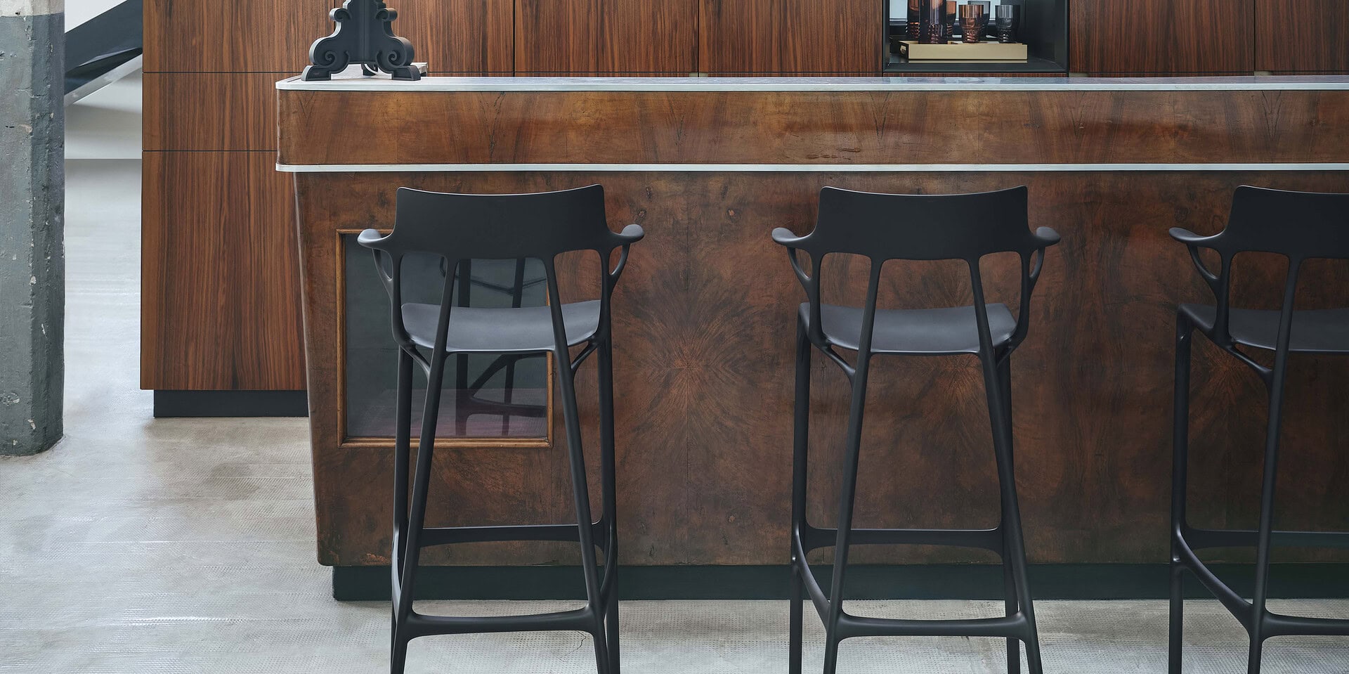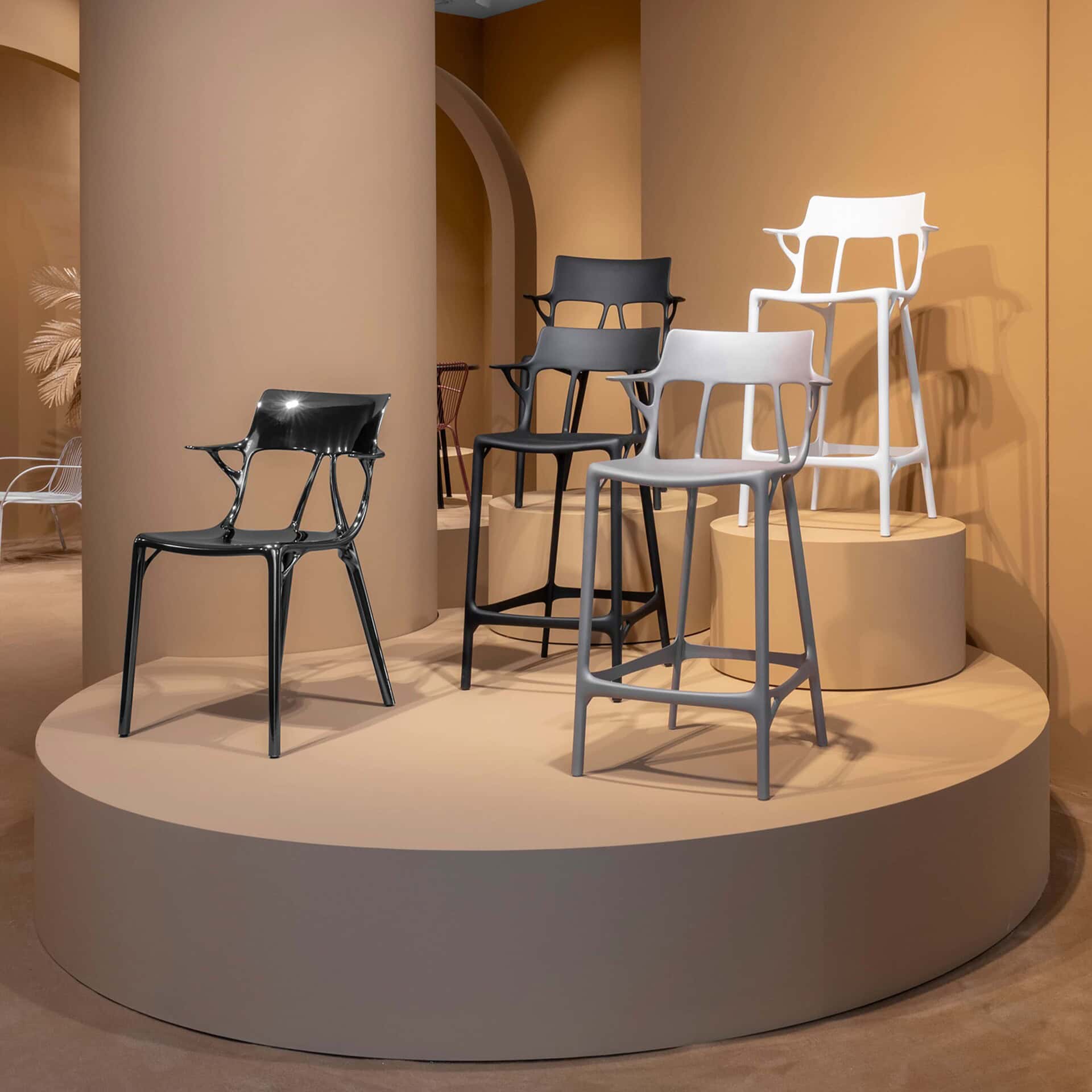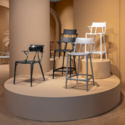 Crafted using artificial intelligence, the eco-friendly A.I. stool is constructed from recycled thermoplastic technopolymer, featuring a soft touch treatment for added comfort. With its broad, welcoming seat, it offers a cozy seating experience, perfectly suited for both indoor and outdoor environments.