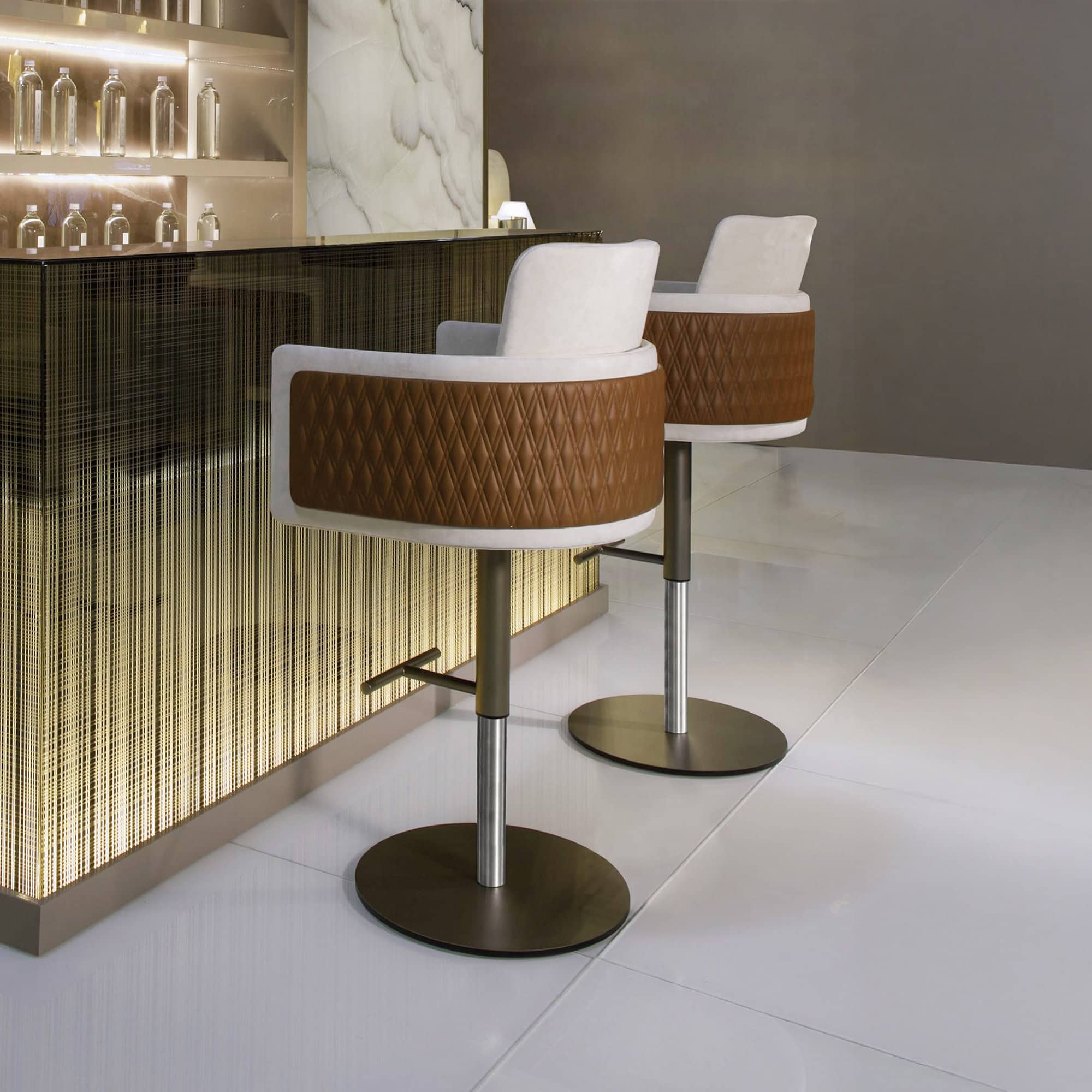 Crafted with a layered, multi-density padded structure, Amet delivers a balanced blend of comfort and support. Available in premium fabrics or leathers, the stool can also be specified with an optional quilted exterior back for added texture and visual depth. Satin metallic finishes and warm bronze tones complement its tailored form, while the grounded pedestal base ensures stability and elegance in any setting. Thoughtfully designed and meticulously executed, Amet embodies Italian craftsmanship at its most polished.