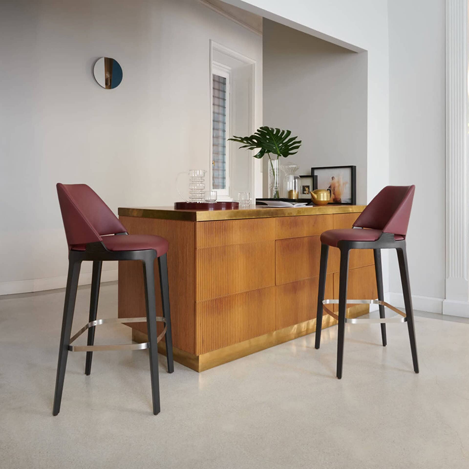 Meticulously crafted, Blossom emphasizes material harmony, pairing luxurious upholstery with a sleek metal base. The padded seat and back are tailored for comfort, enhanced by the option of quilting details for added texture and sophistication. The sturdy pedestal base incorporates a footrest for ergonomic ease, making the stool both practical and visually striking.