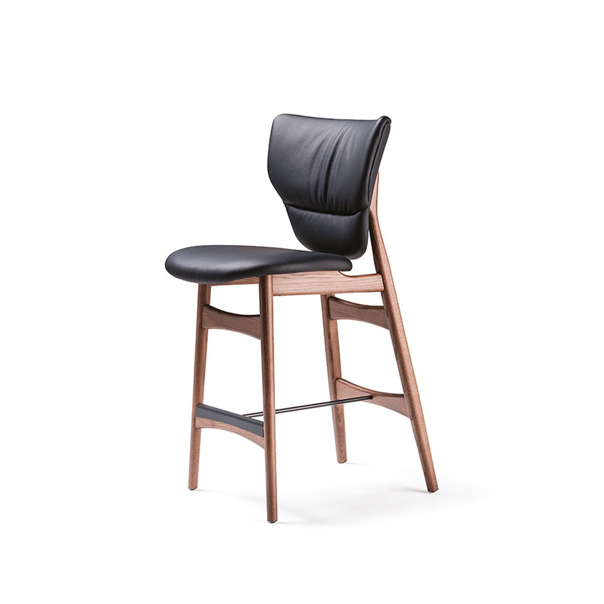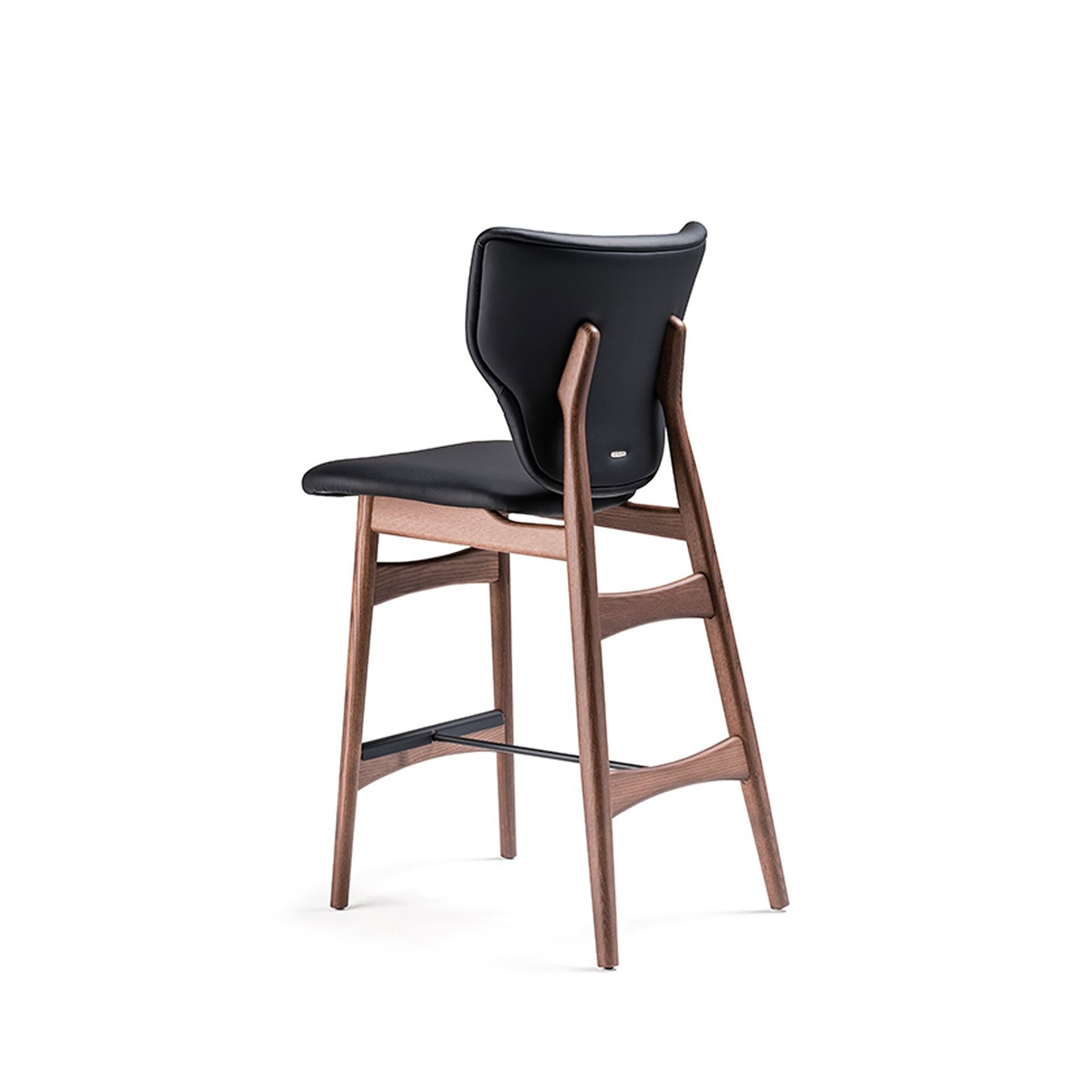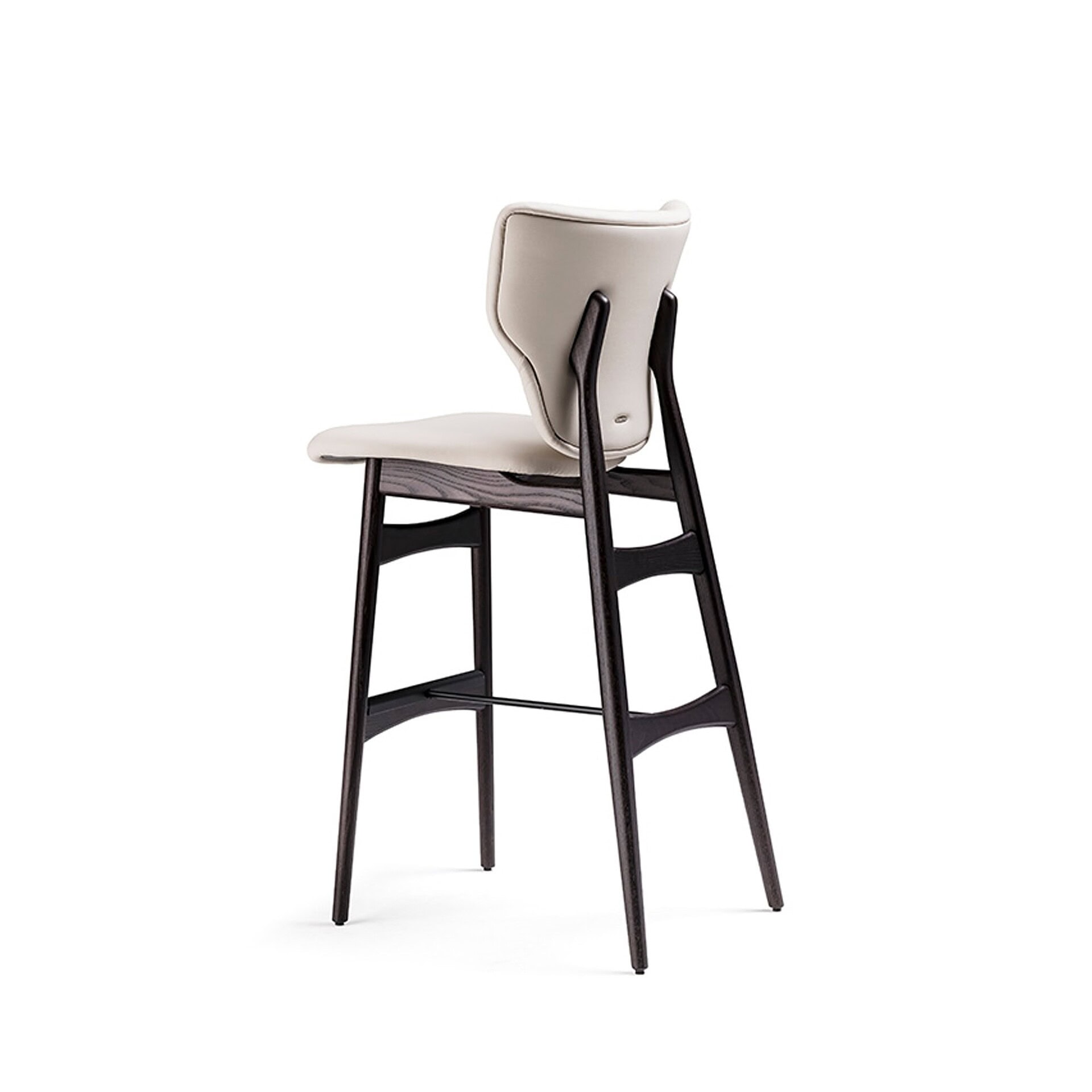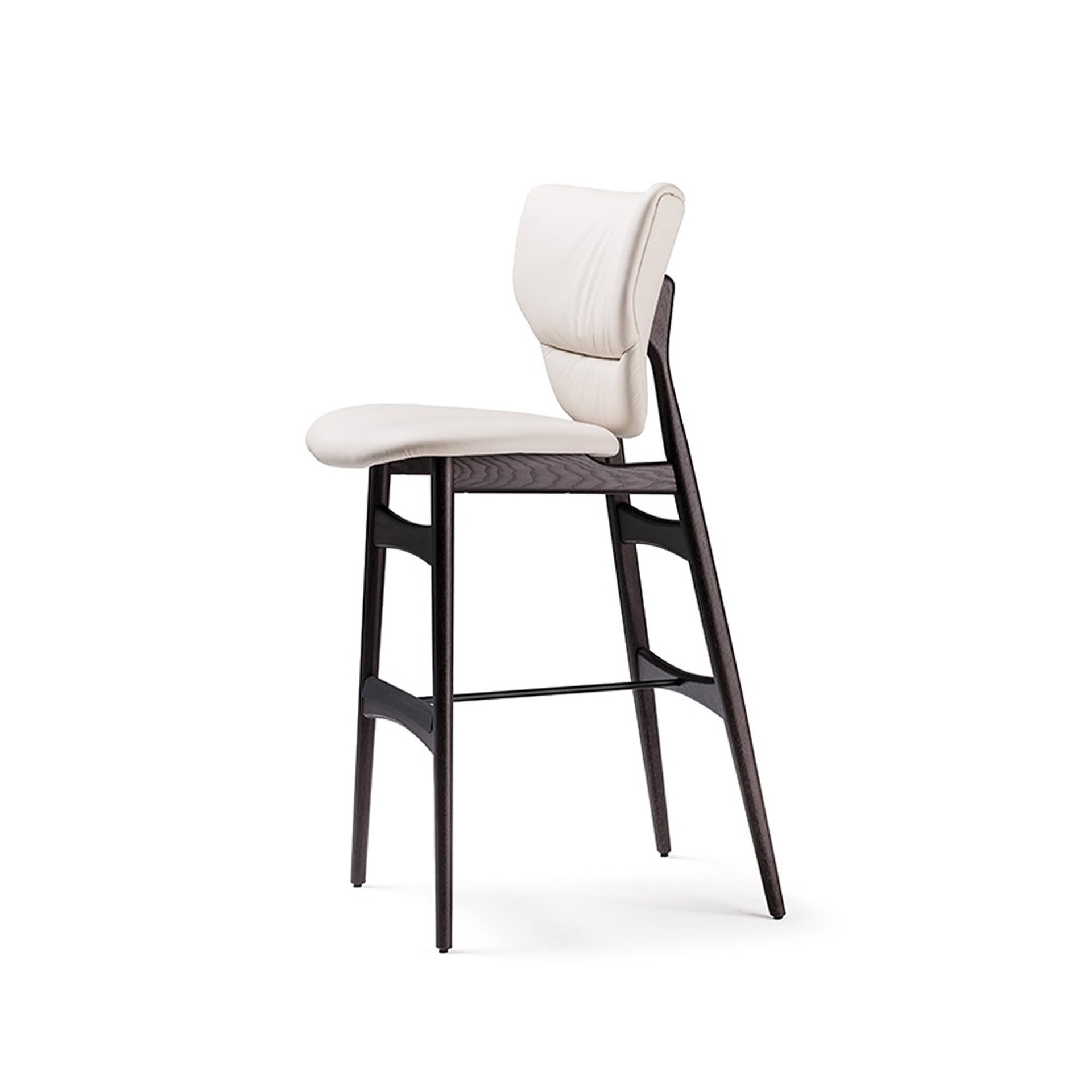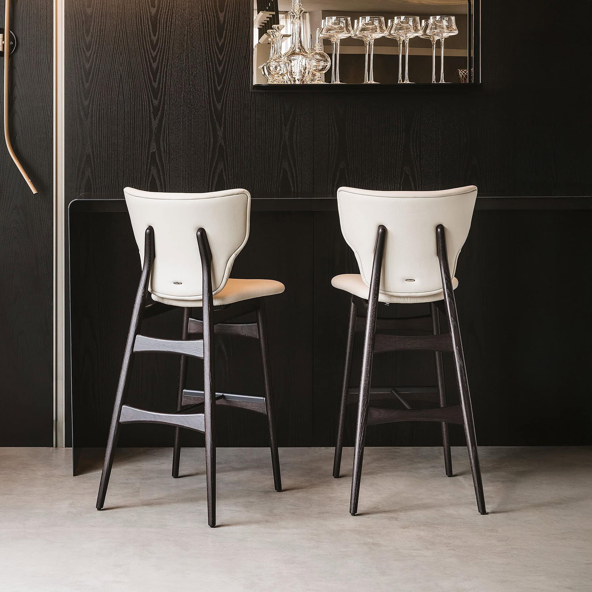 The Dumbo Bar Stool blends Italian craftsmanship with a modern, sculptural silhouette, offering both comfort and style. Its solid ashwood frame showcases the beauty of natural wood grain, expertly finished in a selection of rich stains or painted in an open-pore matte black for a sleek, contemporary look. The seat and back are generously upholstered in premium fabric, supple synthetic leather, or luxurious soft leather, ensuring a tactile and inviting seating experience. With its bold stance and refined details, Dumbo is equally suited for a stylish kitchen island, a chic bar area, or as an elevated accent piece in a reading corner.