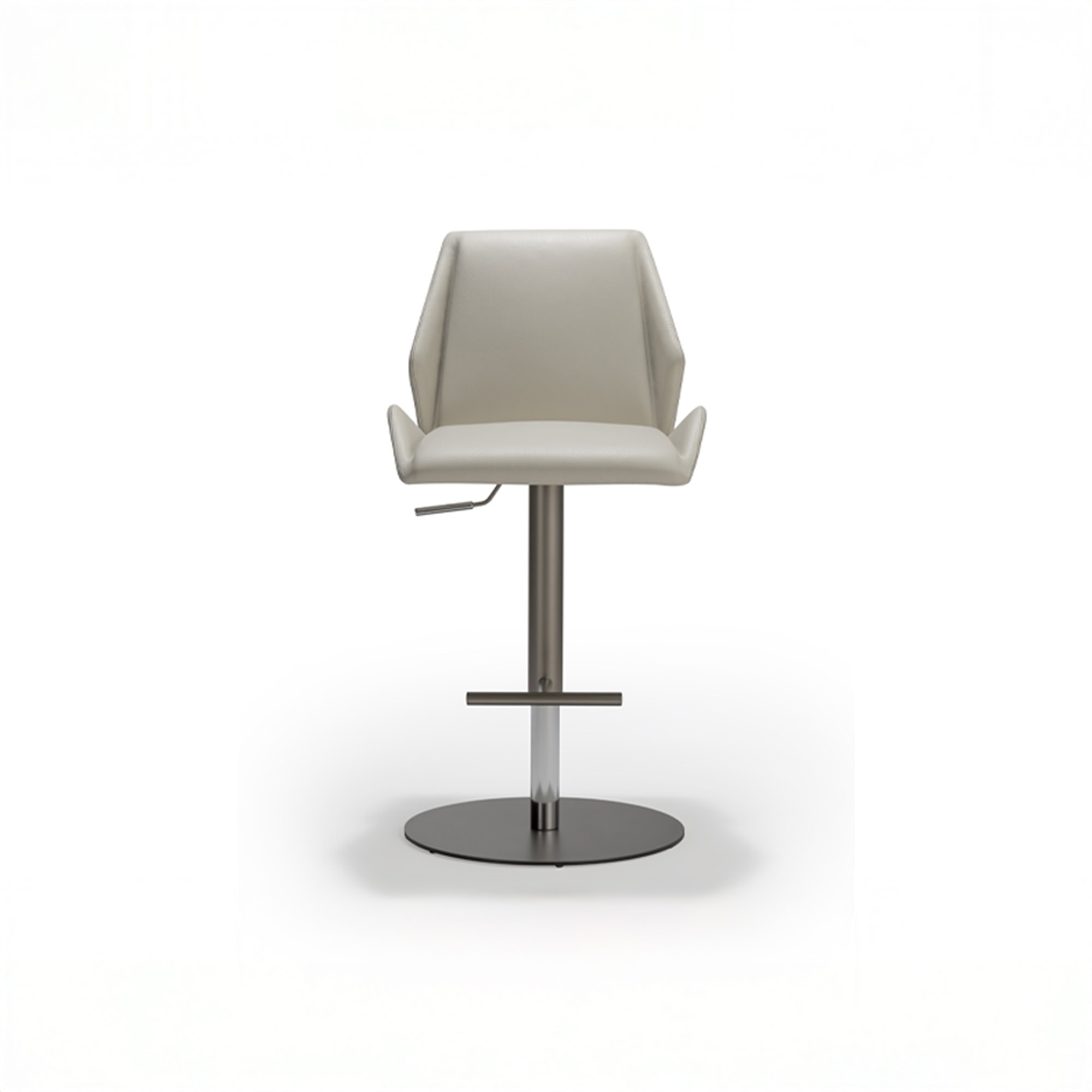Crafted with a solid wood frame, the Origami Bar Stool is available in oakwood Beluga or finished in satin Bronze (100M), Satin Brass (104M), Dark Brass (105M), or Satin Titanium (101M). The seat and back are upholstered for added comfort, with fabric and leather options available by request.