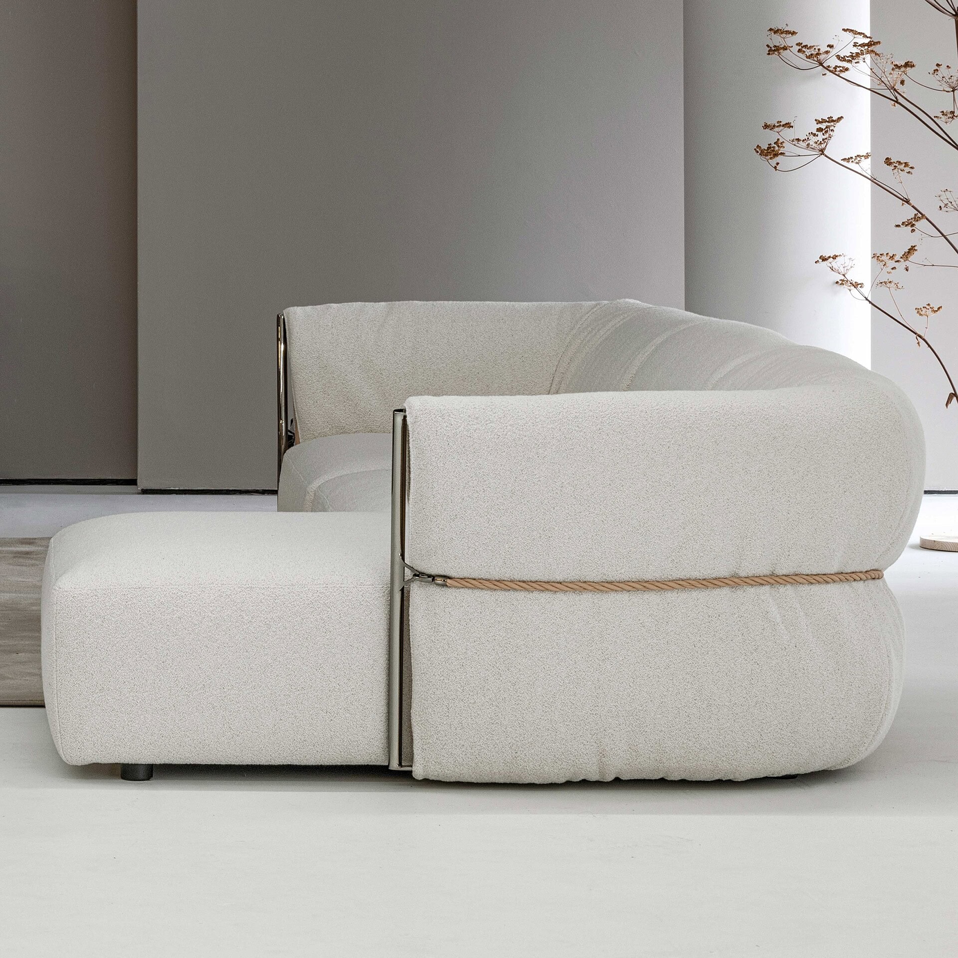 Discover the Belt Sofa: a masterpiece where metallic strength meets chromed elegance. Soft cushions in light hues promise comfort, encircled by a stylish leather belt—more than an adornment, it commands the space with a chic, metropolitan flair.