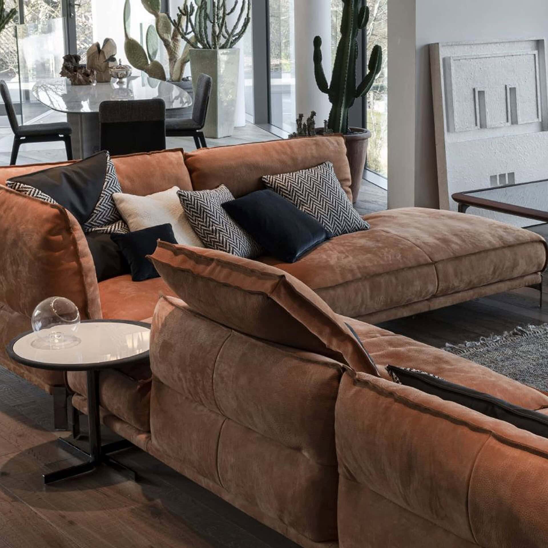 Experience the Belt Sofa's blend of sleek metal, luxurious leather, and sumptuous cushions, delivering a touch of metropolitan sophistication to any space.