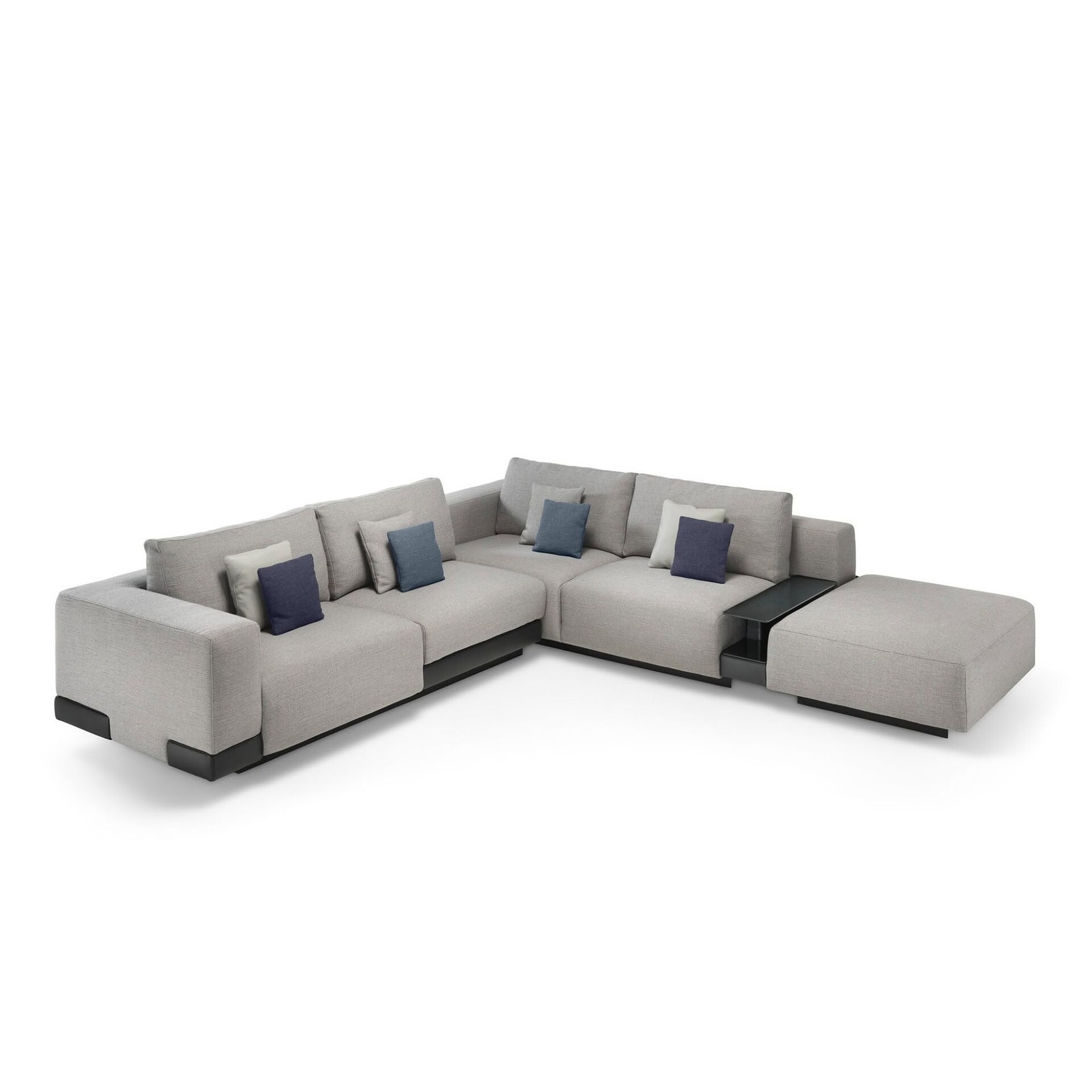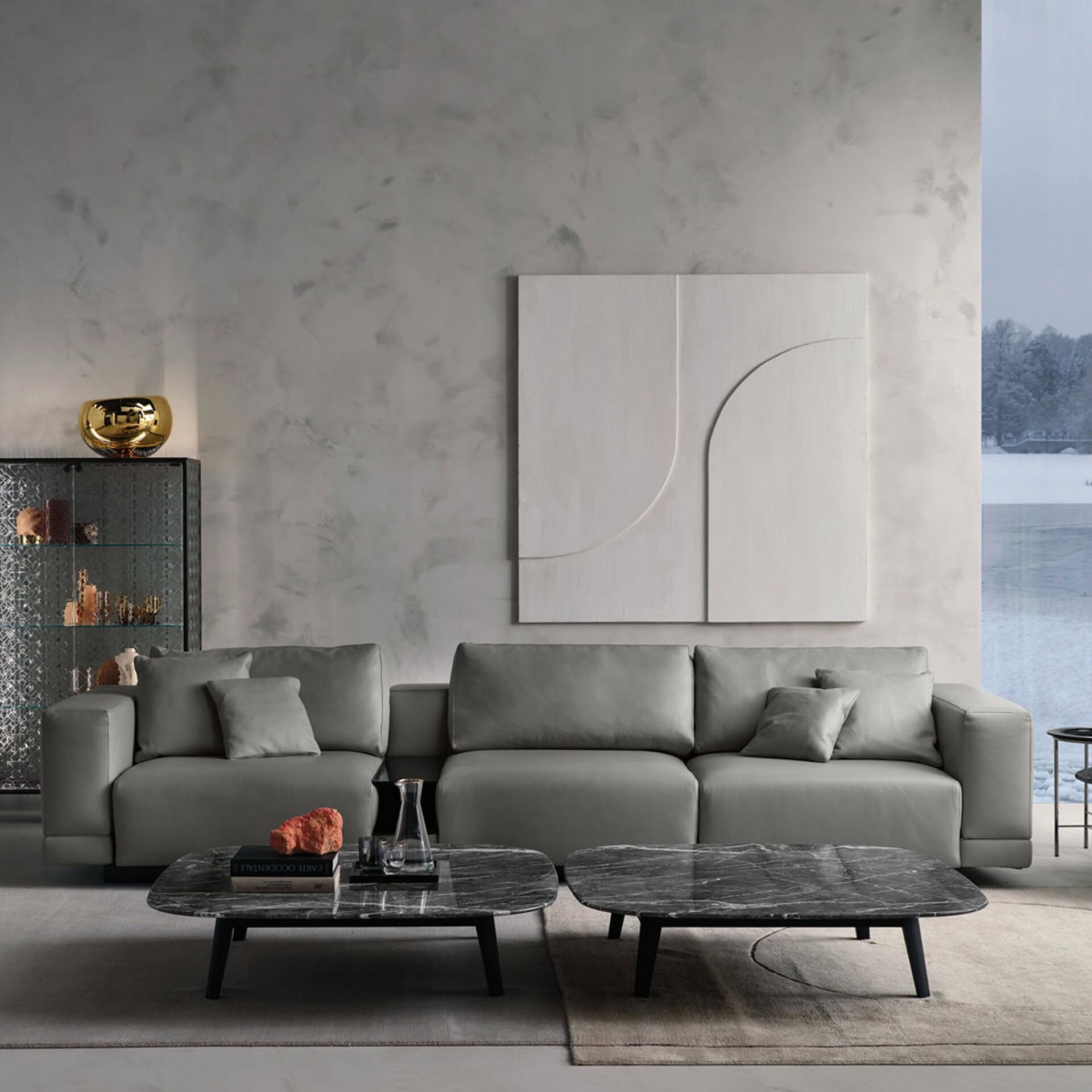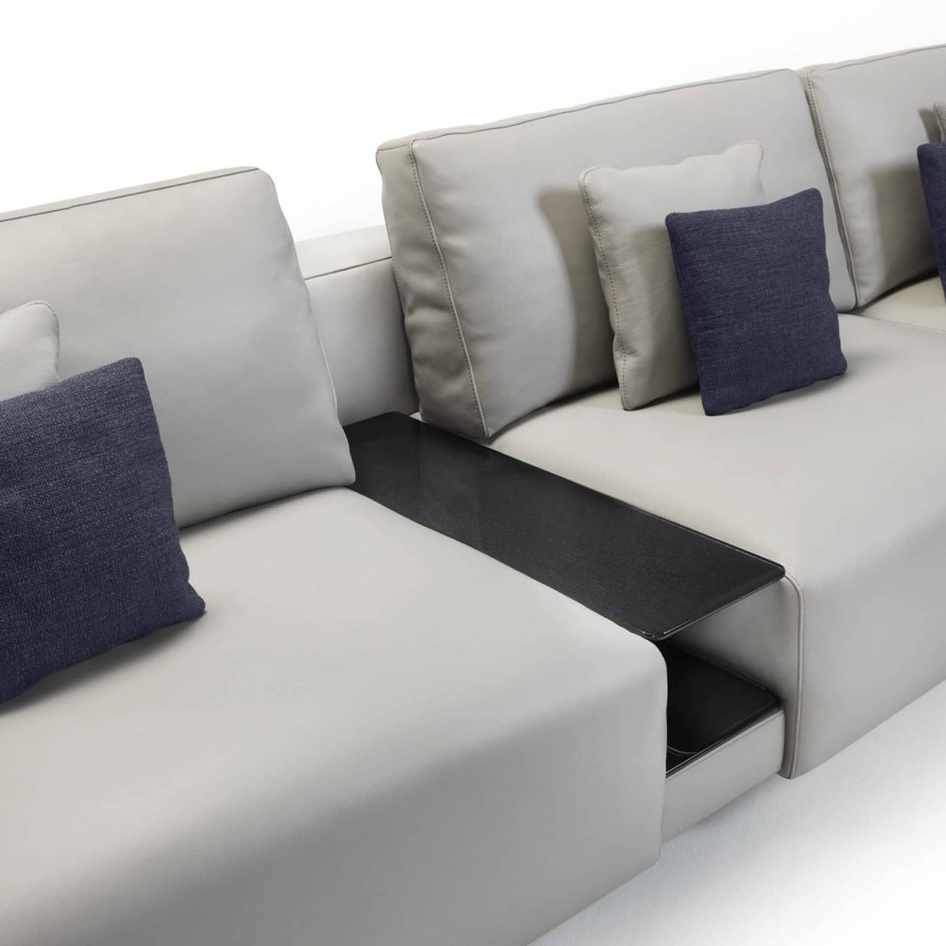 The Carrara Sofa by Matteo Nunziati brings elegant sophistication to modular seating. Whether selected as a fixed or customizable composition, its generous proportions and tailored lines offer contemporary comfort at its finest. The design is elevated—literally—by slender black multilayer base elements that create a subtle floating effect, while its deep cushions blend high-density polyurethane and memory foam for perfect support. A luxurious tray detail, always clad in Silky leather, adds a functional and decorative touch to select modules.