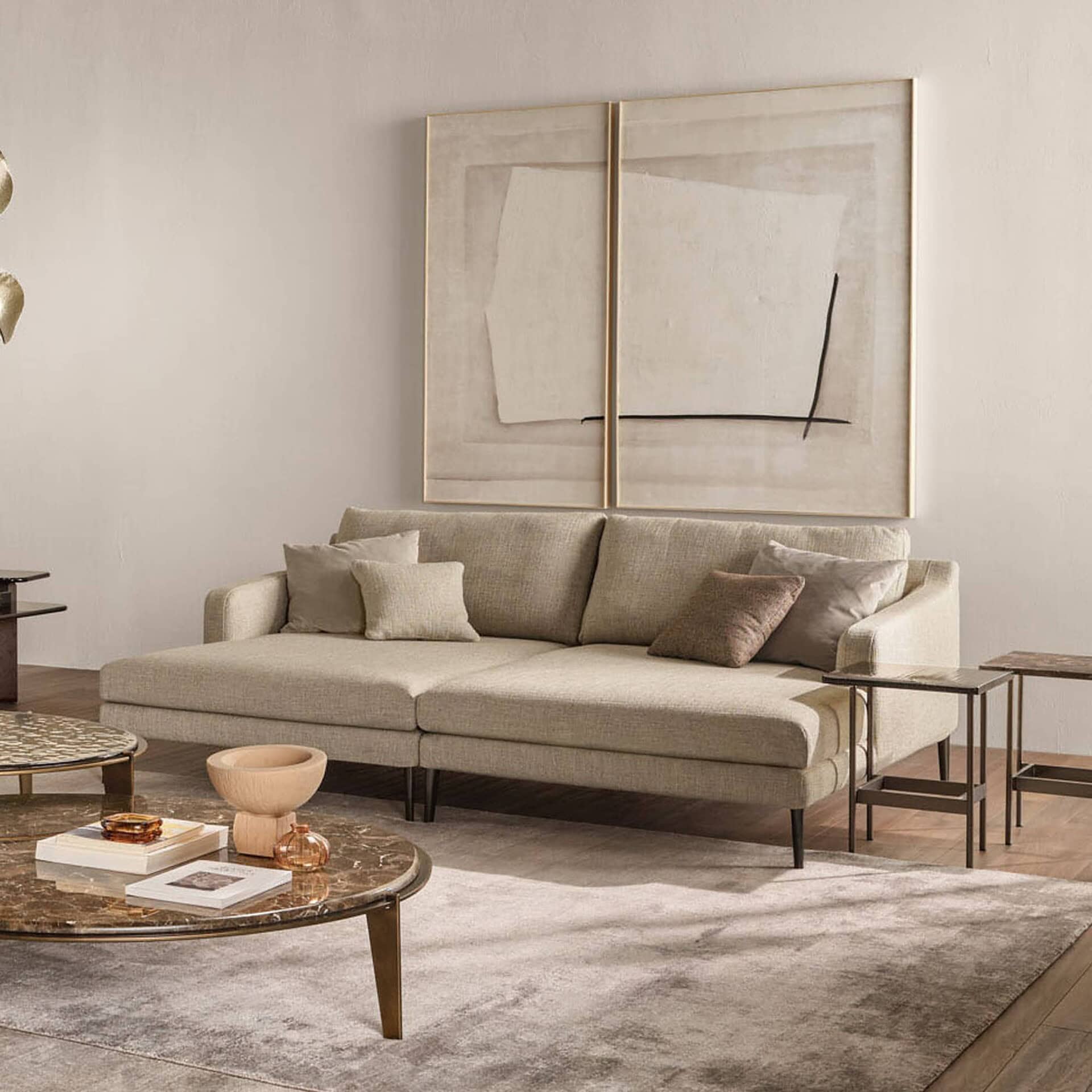 The internal structure is crafted from multi-layered wood for durability, while the seating is supported by elastic straps that deliver lasting resilience. Seat cushions are padded in high-density polyurethane foam for balanced comfort, while the back cushions are filled with sterilized goose down for an indulgent, plush feel. Both the seat and back cushions are fully removable, whether upholstered in leather or fabric. The sofa structure is removable in fabric versions only. Choose from a curated selection of upholstery across TX-1 to TX-3 fabric categories or PL-2 and PL-5 leather options for a personalized finish.