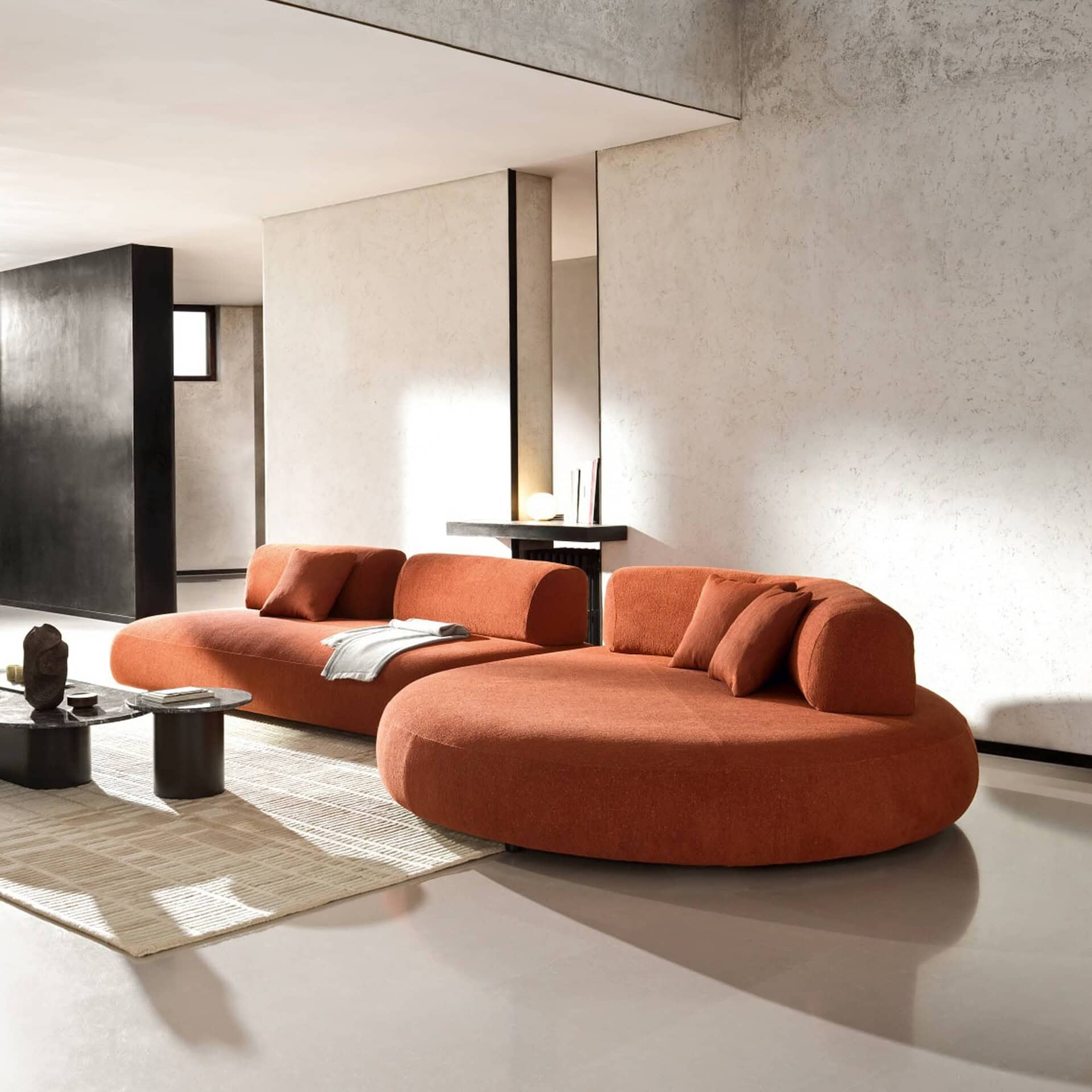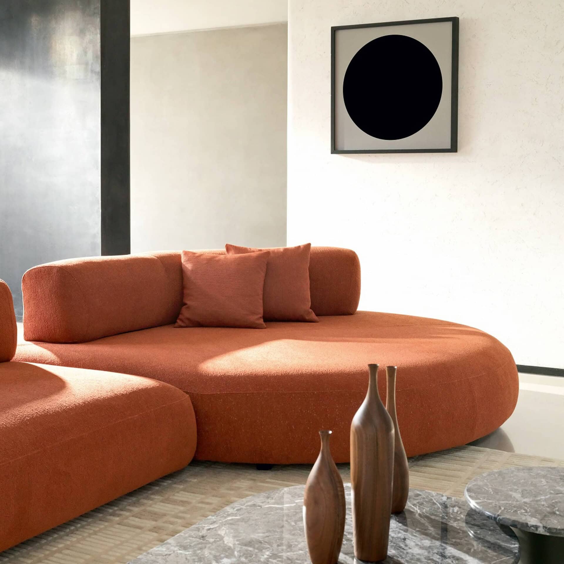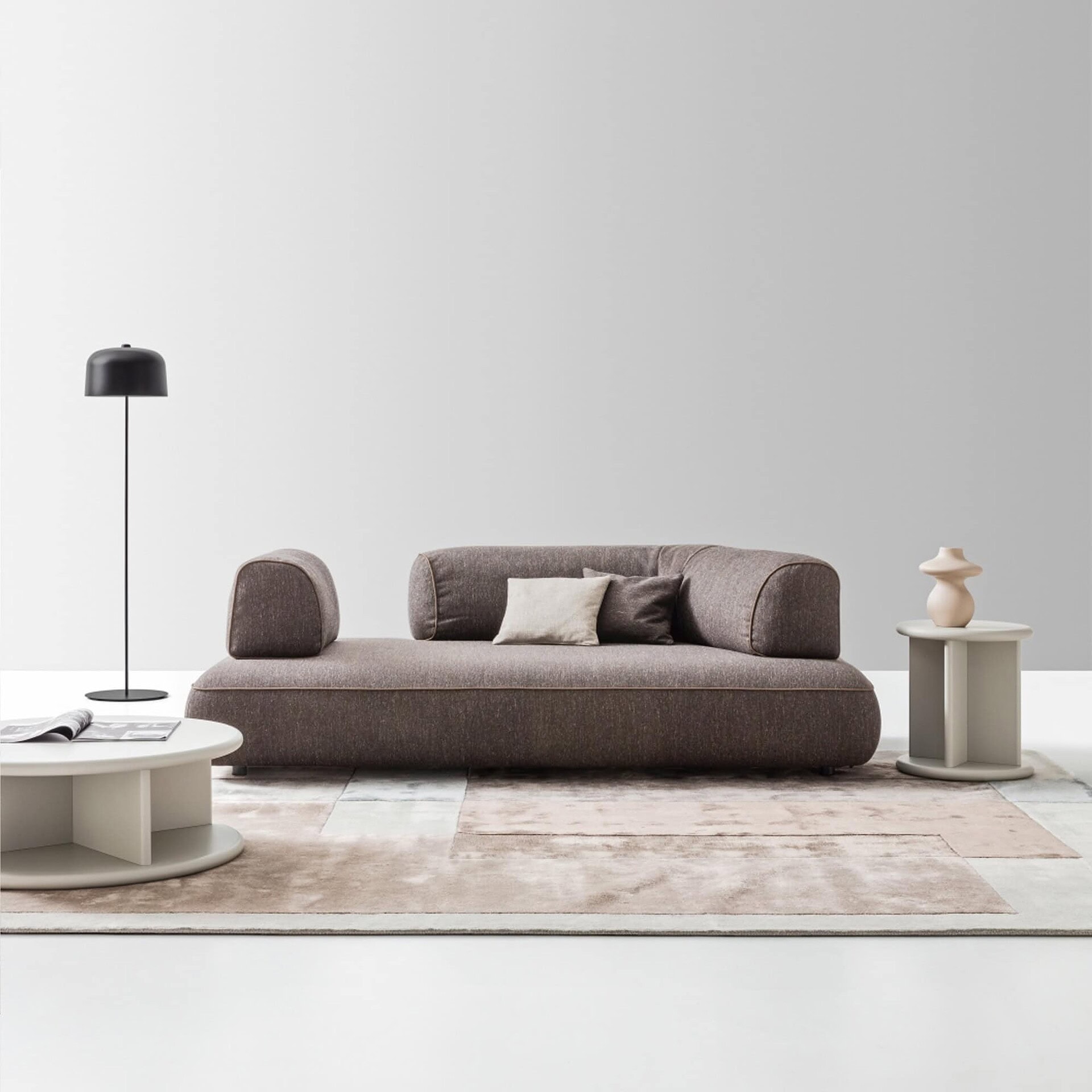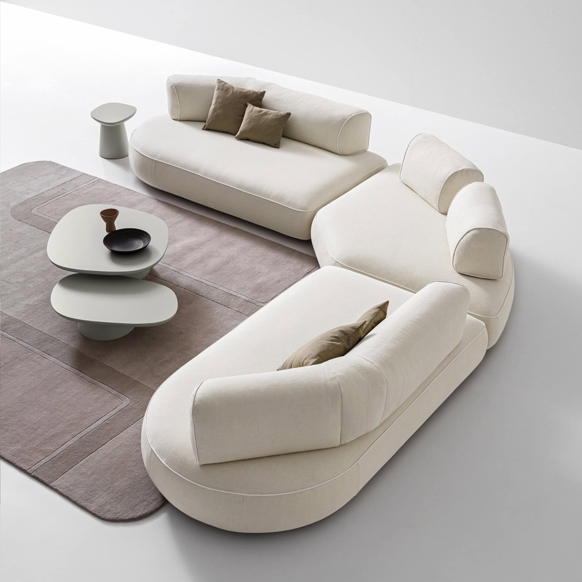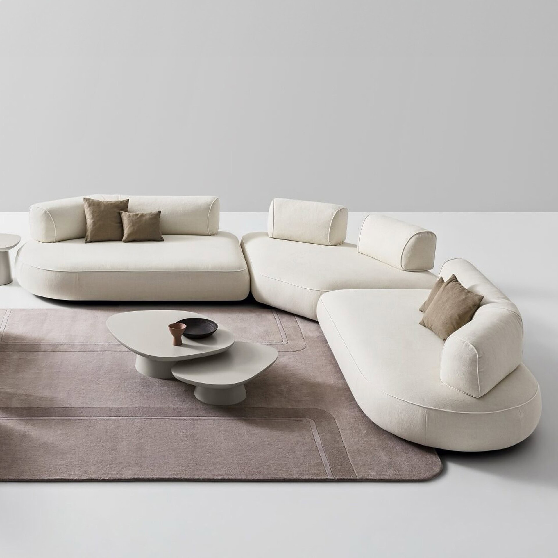 The Isla Sofa embodies a vision of compositional freedom paired with casual elegance, featuring an array of rounded shapes—like an archipelago—offering flexible and comfortable seating.