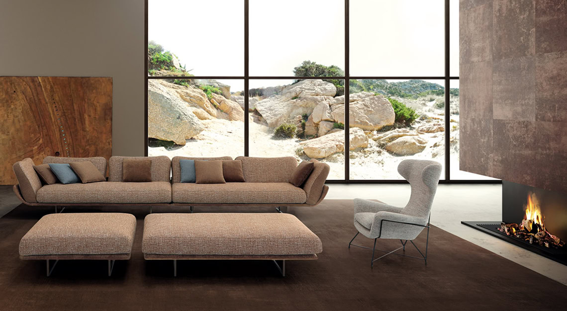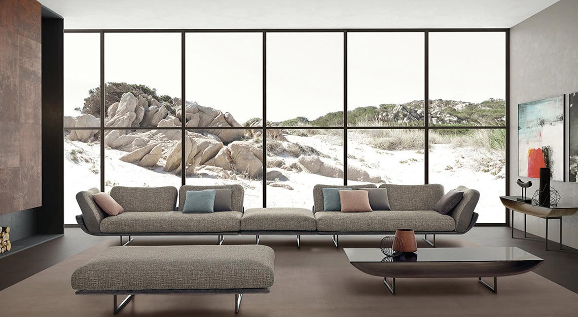 The Free Spirit Linear Sofa is extremely versatile. It is defined by an upholstered metal tray that forms the sides and back and holds the cushions.