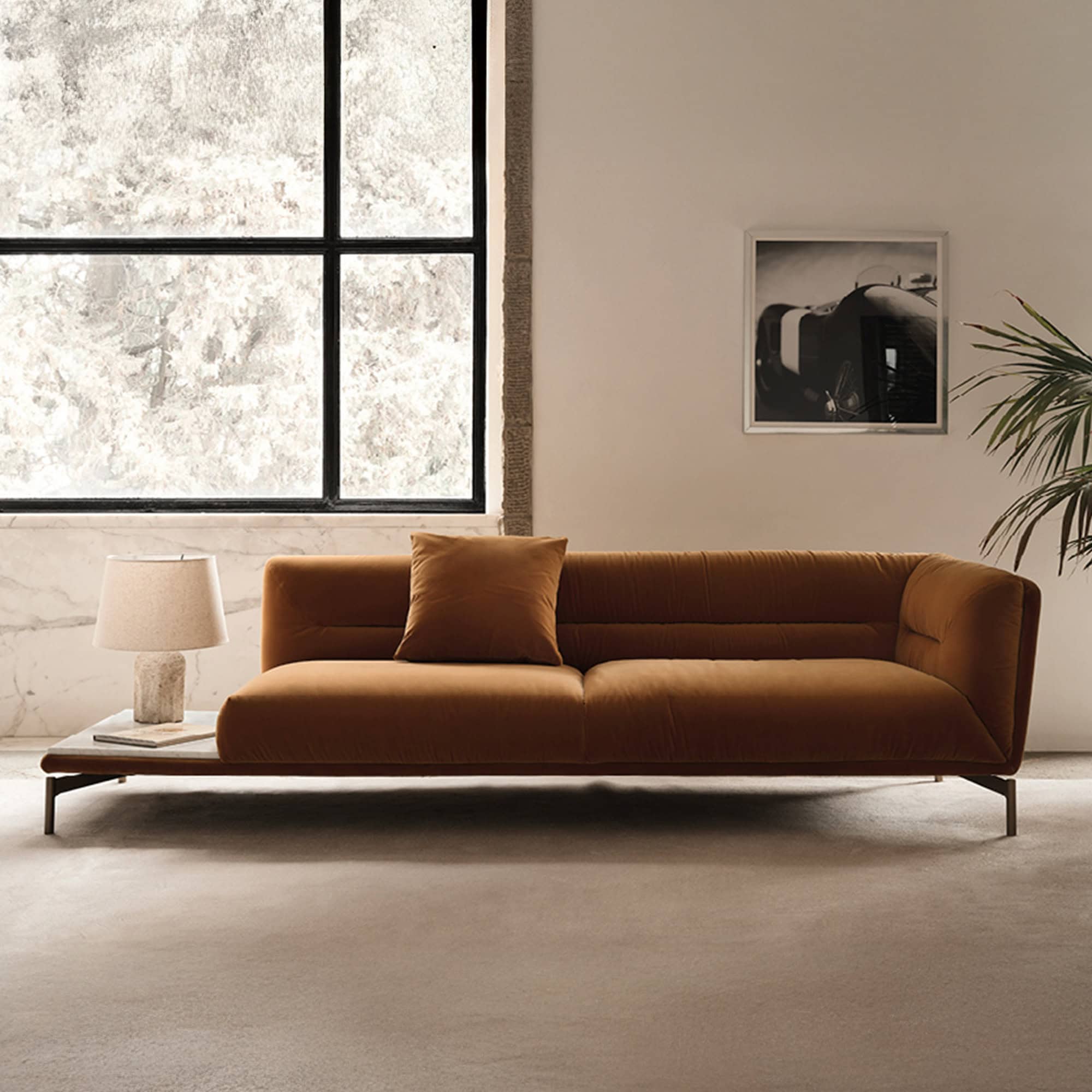 Solid fir and MDF frame with metal reinforcements. Upholstery in non-removable leather or fabric. Cushions in multi-density polyurethane foam. Metal legs in Gunmetal, Satin Brass, or Antique Bronze. Optional marble tops in Carrara, Emperador, or Black Marquina.