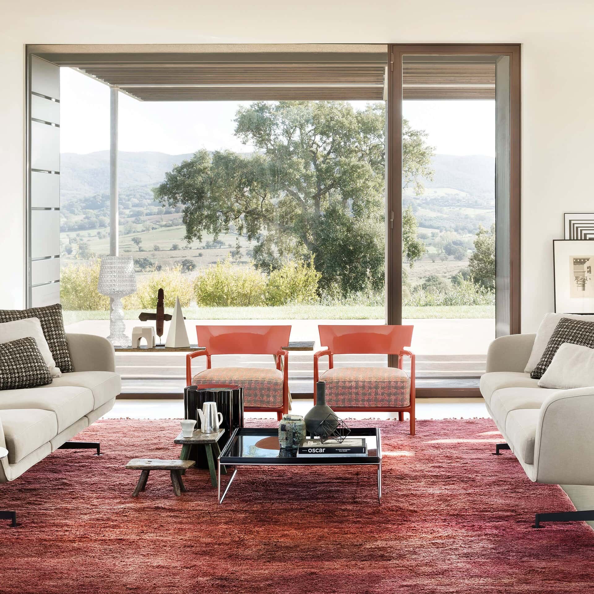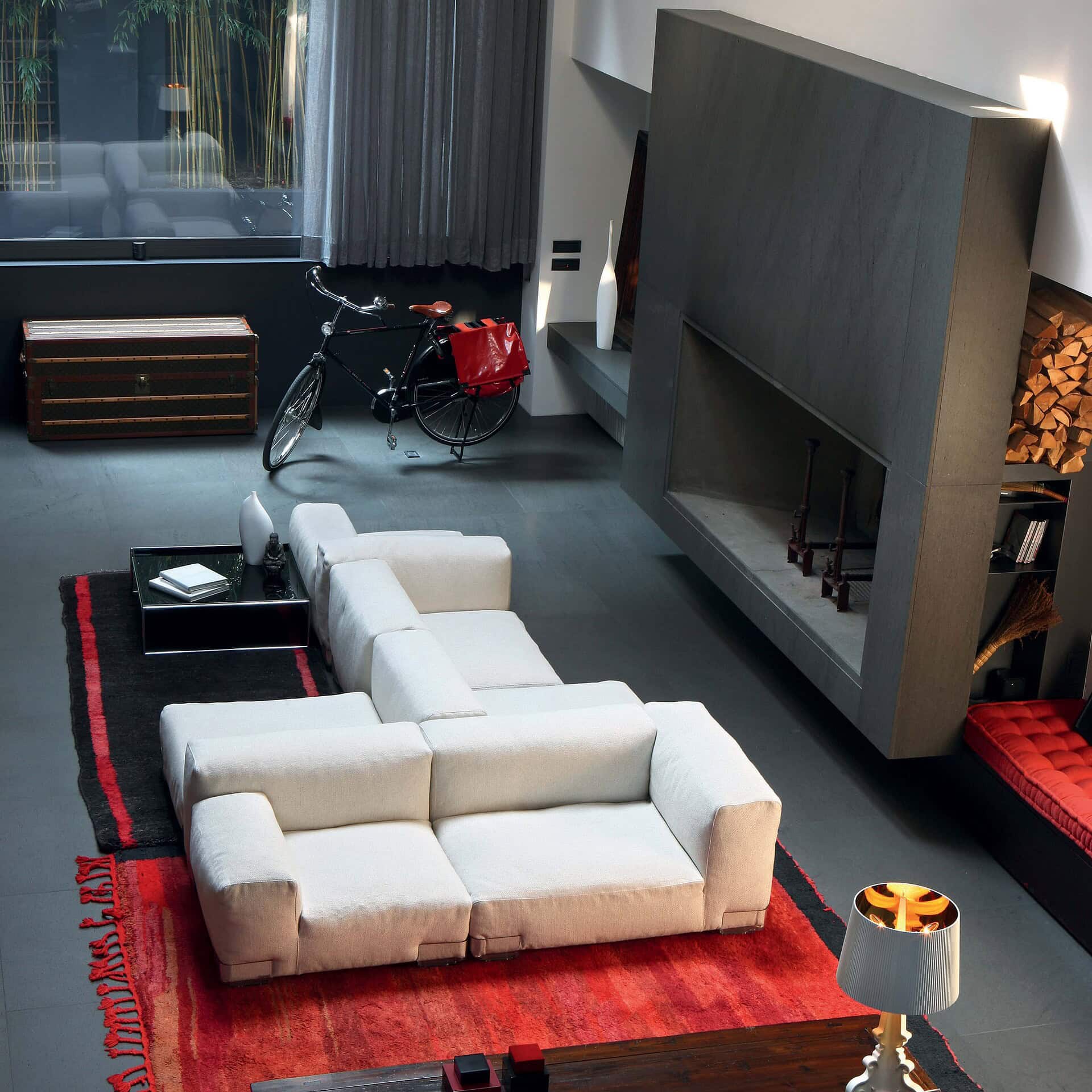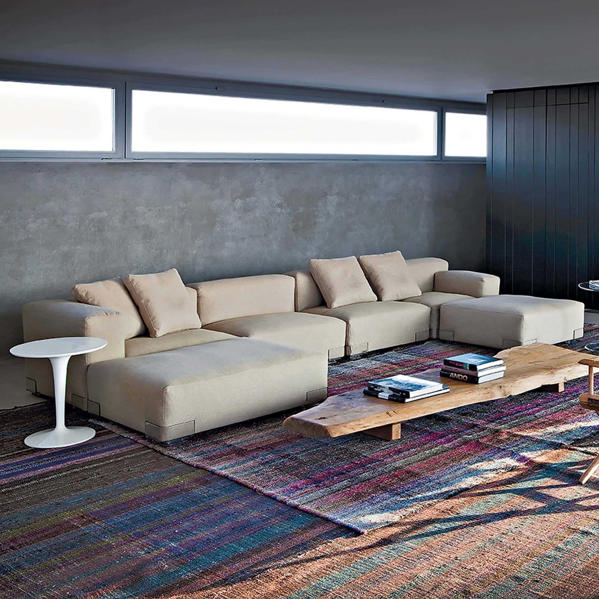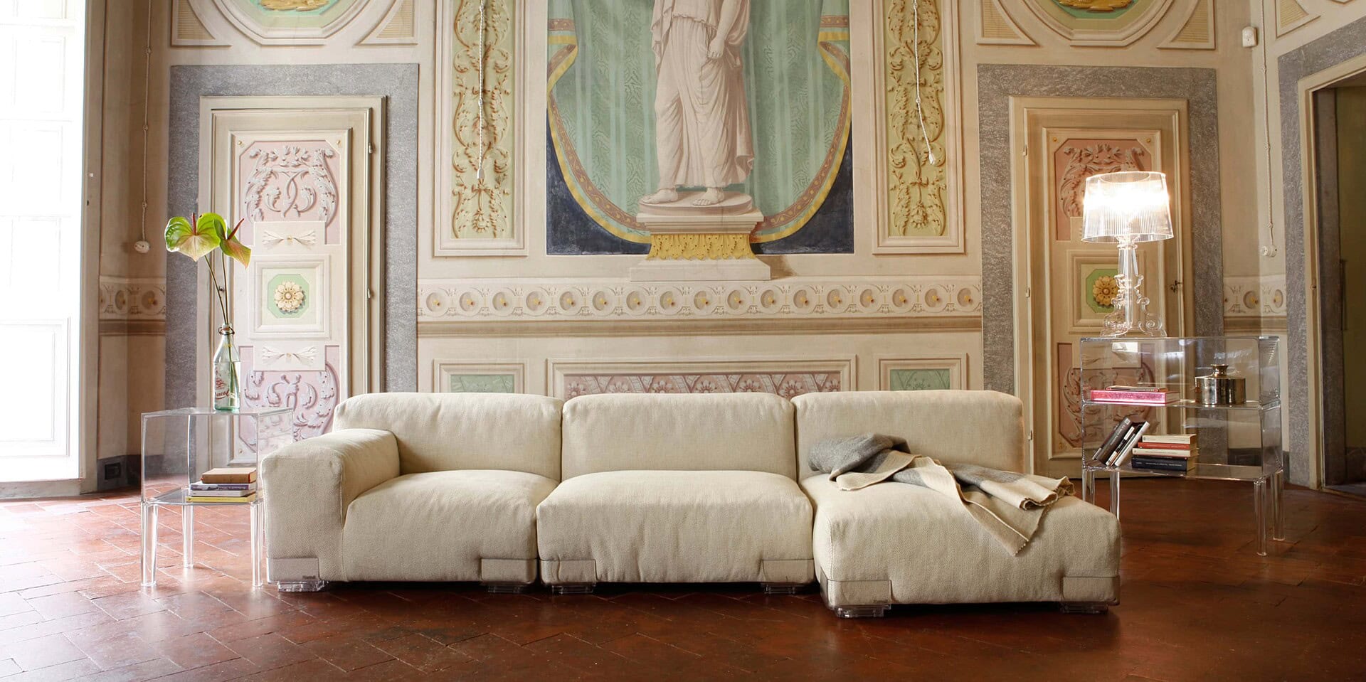 Plastics modular seating systems feature transparent polycarbonate feet to add an air of sophistication to their upholstery fabric. With its comfort and soft qualities, elegant yet easy qualities, this sofa is a true home sofa. Currently, the seat can be found in two sizes, 88 cm and 114 cm, as well as two arm heights. The chair comes in three different models: a seat with back, a left arm sofa, and a right arm sofa. A pouf is also available. The velvety Nile and Eskimo fabrics range in color from white to dove and olive green to orange.