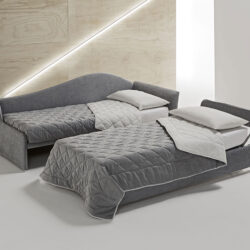 The Dalila Sofa Bed is perfect for any room, with its 3-seater design offering seating and sleeping. It has a high-quality foam upholstery and polyester fiber backrest for comfort, plus a metallic frame and external parts in wooden chipboard. It has a wooden slats mechanism with beechwood slats, a handle to raise the bed, and a patented anti-closing mechanism. Options include an electro-welded mechanism, spring mattresses, a quilt for the lower bed, and a box storage.