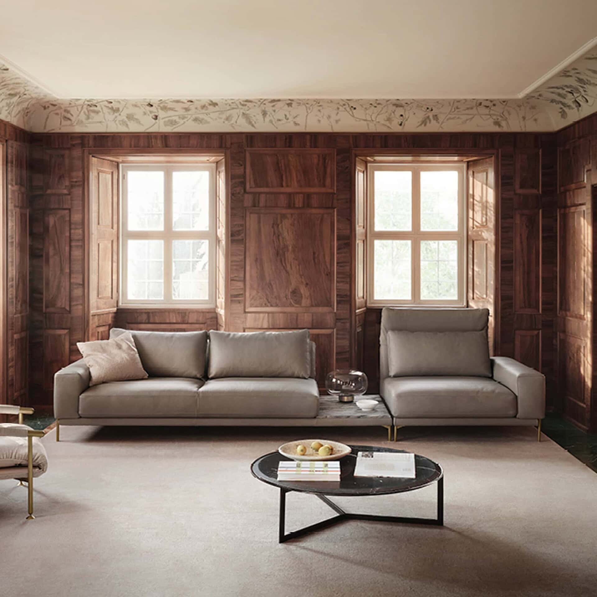 With its sculptural form and dynamic comfort features, Strauss balances artisan craftsmanship with technological refinement. Its modular design allows for various configurations, ideal for spaces of all sizes. The finished sides and optional marble-topped elements further enhance its luxurious feel, while thoughtful details like contrast stitching and premium coverings add a bespoke quality.