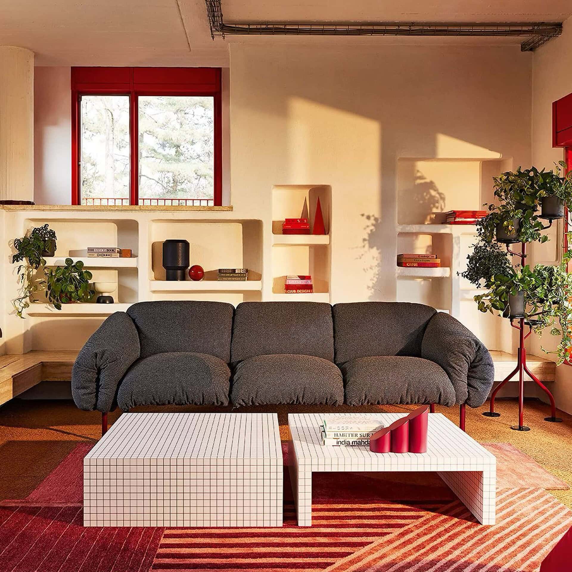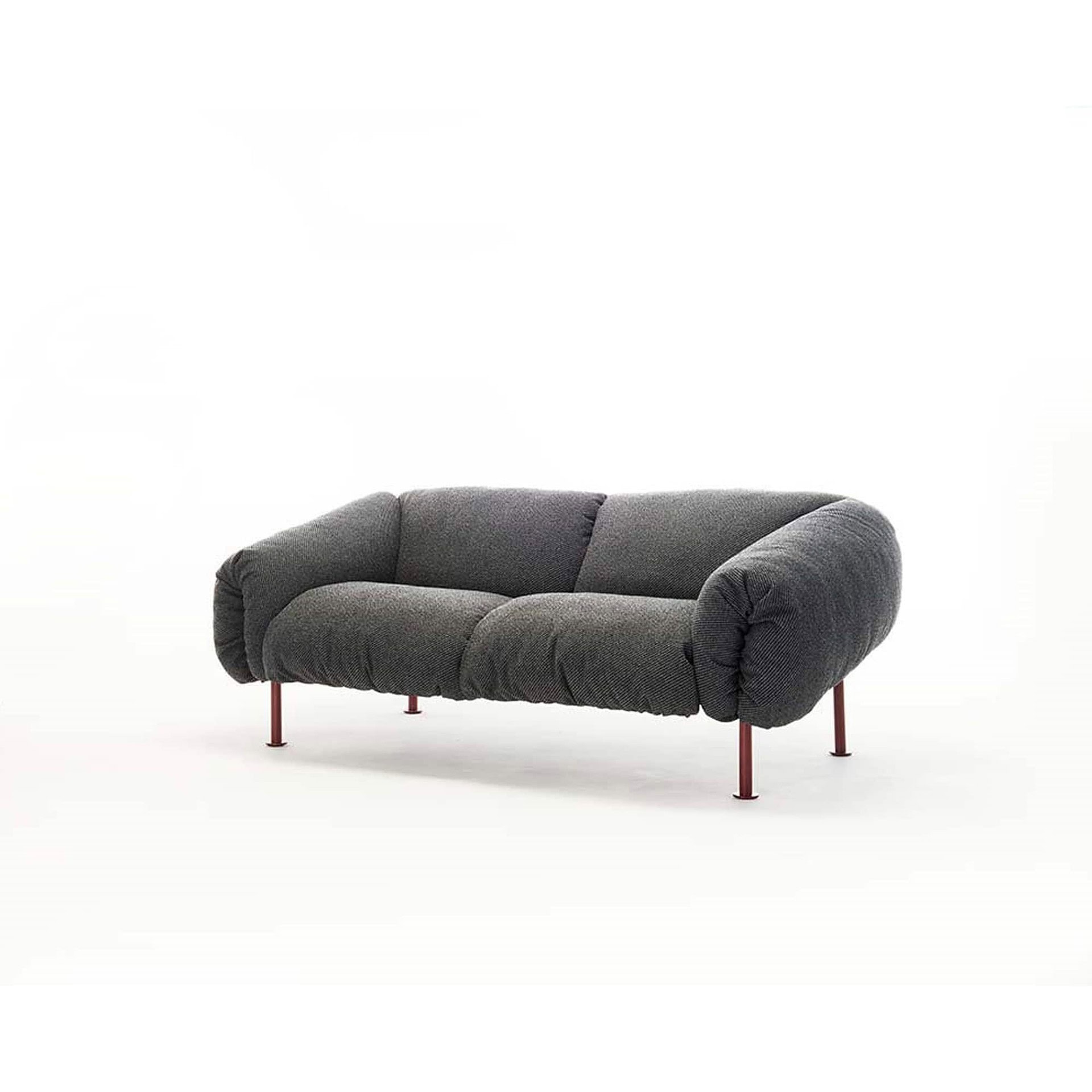 Designed by Zaven for Zanotta, the Za:Za Sofa blends sculptural form with sustainable innovation. Its distinctive metal frame, available in bold hues like orange, amaranth, grass green, or black, provides a graphic, architectural outline that supports plush cushions with taut anthracite polyester straps. Designed for comfort without compromise, its soft seat, back, and arm cushions are made from polyurethane and regenerable polyester balls, crafted without adhesives and featuring removable fabric covers for easy upkeep.