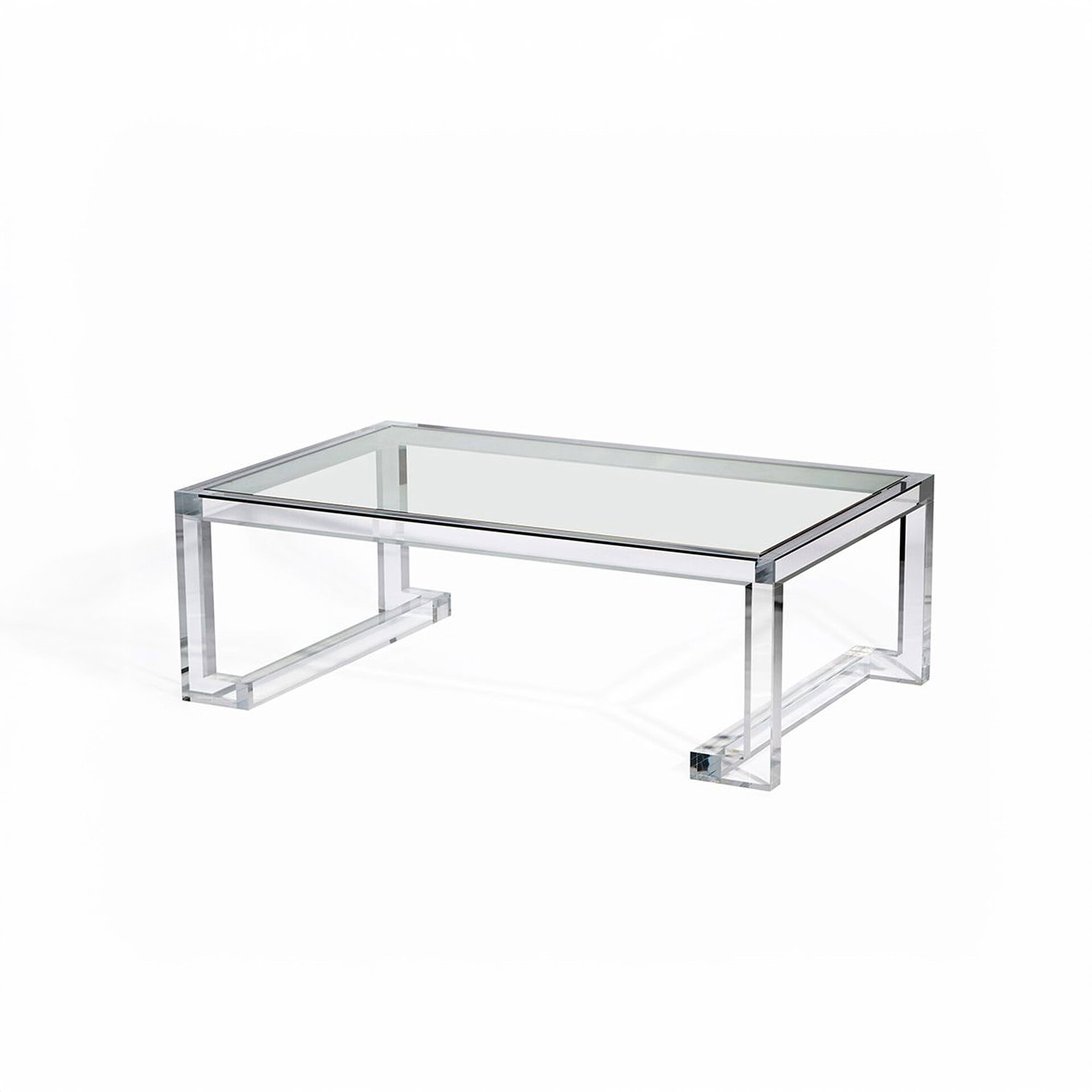 The Ava Cocktail Table is available in a clear finish, combining clear acrylic and clear glass to ensure a versatile and neutral palette that enhances any color scheme or decorative theme.
