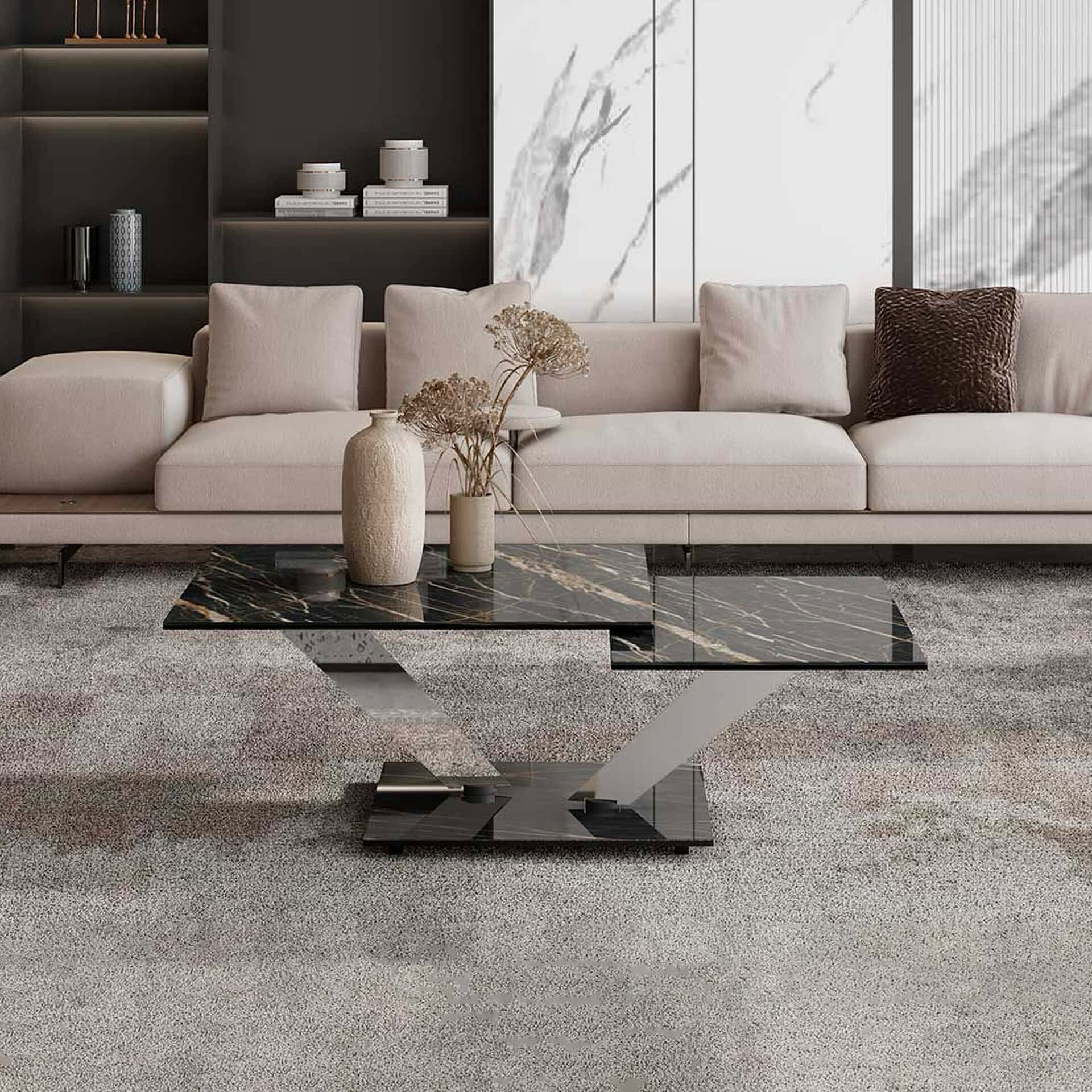 Designed by Louis A. Lara, the Dino Triangular Coffee Table brings sculptural sophistication to any living space with its soft, organic triangular form. Its grey-tinted tempered glass top appears to float above brushed carbon steel legs, creating a light, architectural presence that complements both sectional seating and traditional sofa arrangements. Updated finishes and refined detailing ensure that Dino remains a modern classic—versatile, elegant, and highly functional.