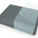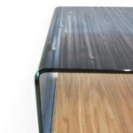 Extra clear curved glass, glass edge with plastic bumpers; finishing in lacquered natural oak wood veneer; anodized aluminum support rails.