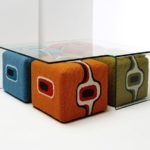 The Tetra is constructed of 5/8" bent glass, with plastic glides on the legs to protect your floor. The space underneath is a great size to store spare poufs or ottoman-style seating. Designed by Javier Palomares. Warranted to meet or exceed industry standards.