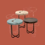 A collection of low tables, tables, desks and furniture featuring a wooden top with a laser-cut metal insert, and a metal base.