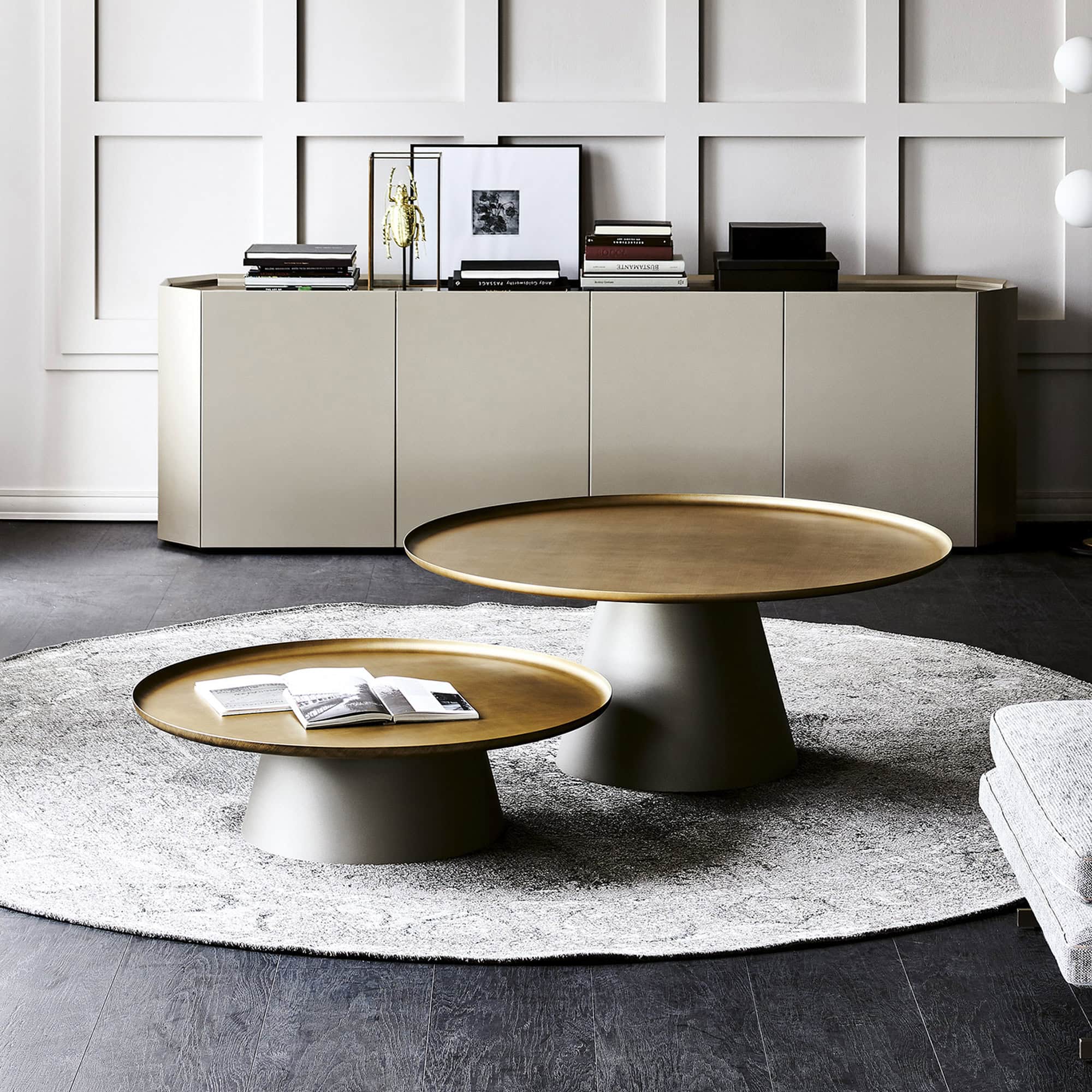 The Amerigo Round Coffee Table showcases Italian design with a sculptural form and refined materials. Its titanium embossed steel base supports a brushed metal top, creating a striking balance of strength and elegance. With its subtle reflective finish, Amerigo adds depth and sophistication to both modern and transitional living spaces.