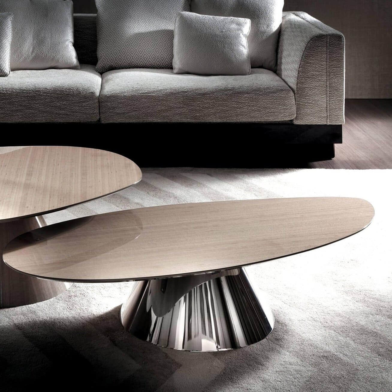 This contemporary coffee table has a sleek, asymmetrical design, and eye-catching accents to finish it off. Gloss lacquer, matt and gloss wood, and other finishes are all available options.