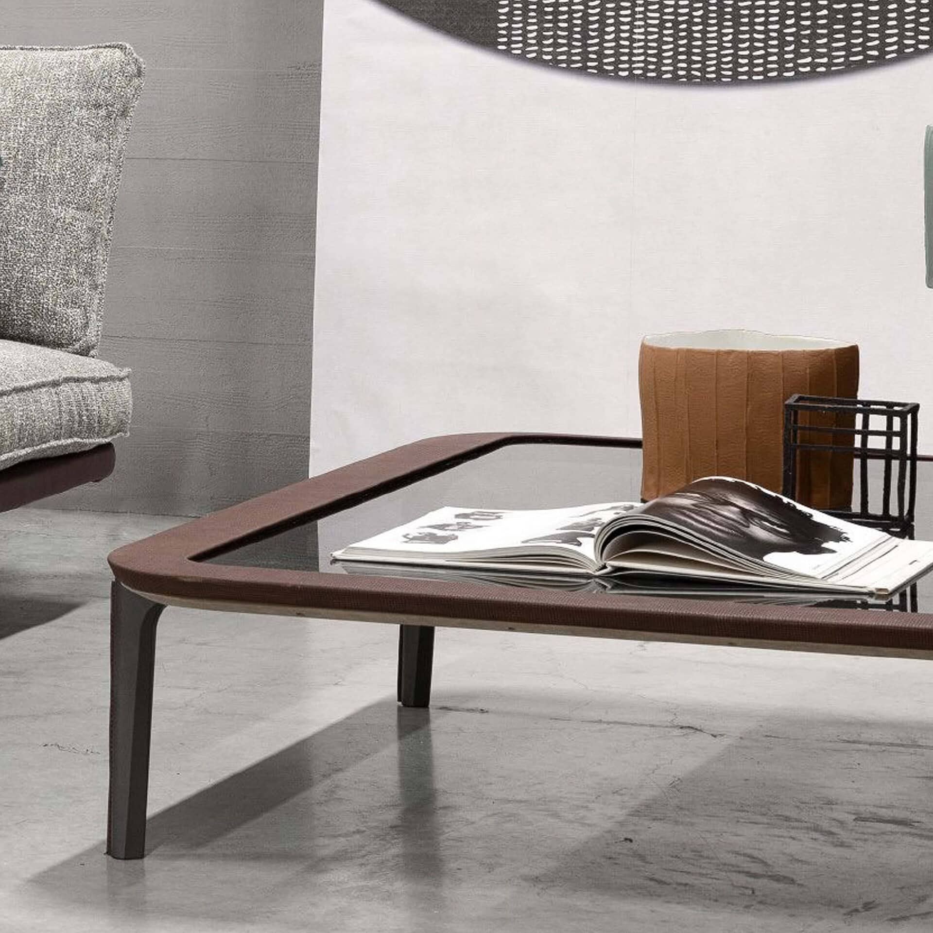 This coffee table has a rounded design with no corners, with a leather top and a worked leather frame. It has thin feet made of varnished wood with a leather detailing. It is extremely light and versatile, and it combines different materials in a way that complements each other well. Having the Edge coffee table collection is an emblem of attention to detail, just as you would expect from a real Made in Italy product. There are various shapes that you can choose from, depending on your needs.