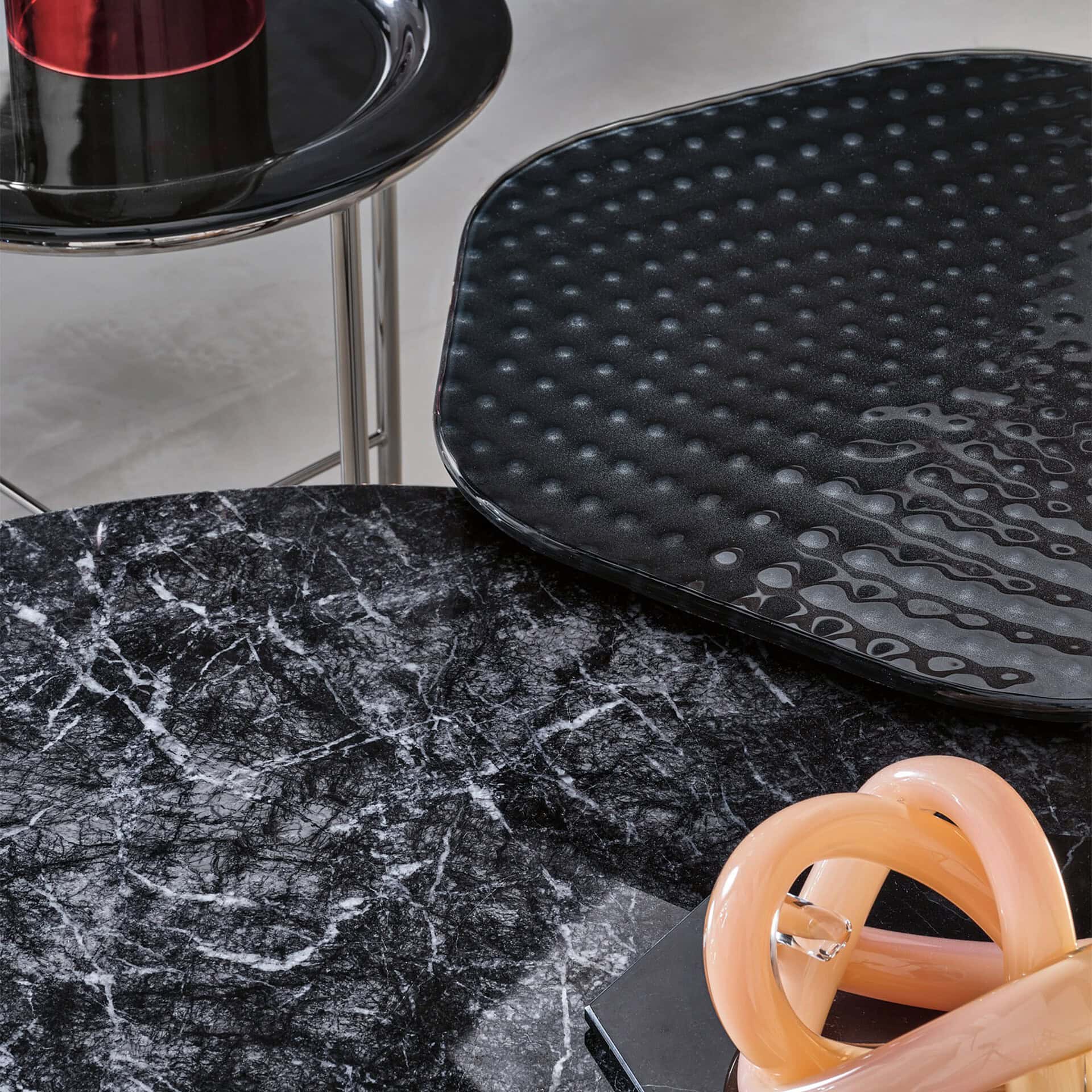Crafted from 12 mm fused and tempered glass, the top is offered in transparent or metallic back-lacquered finishes that enhance its dimensional surface. The sculpted metal base, finished in matte Lava Grey, provides architectural grounding and visual contrast. Designed with both elegance and durability in mind, Coral Beach supports up to 66 lbs, making it a functional yet art-driven centerpiece.
