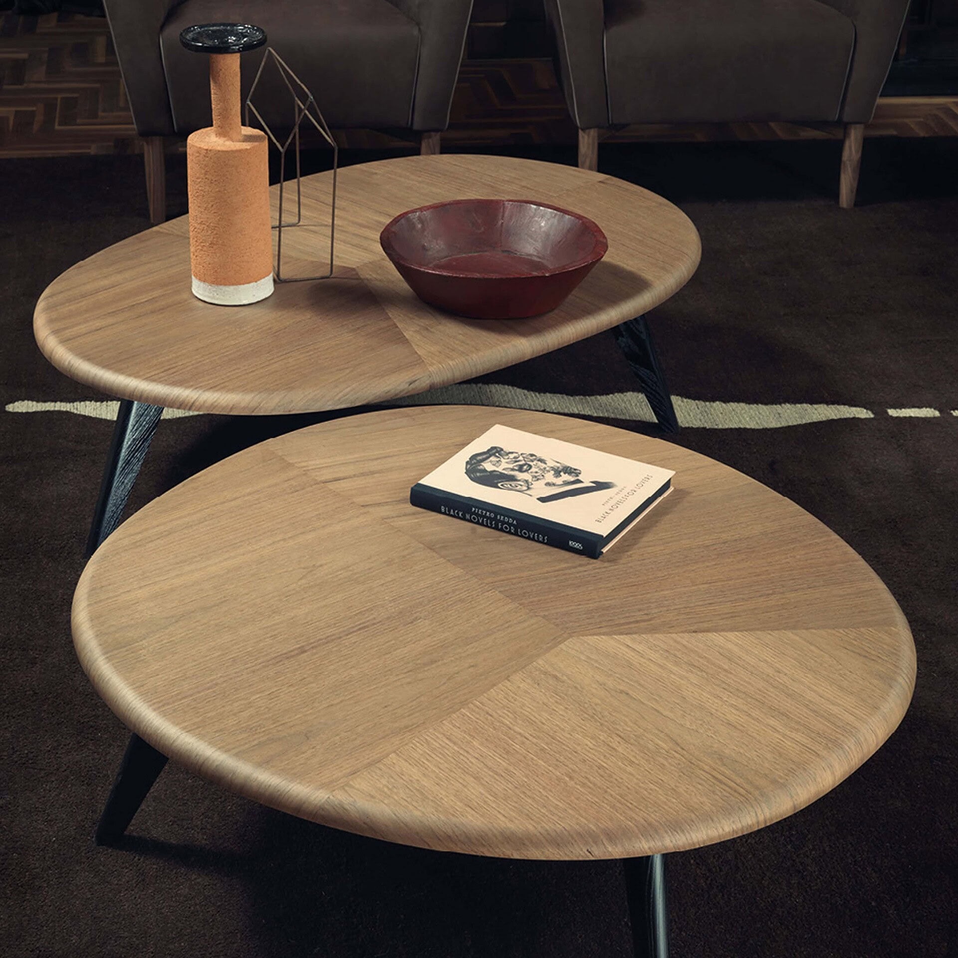 This pair of small tables with irregular wooden tops, characterized by rich canletto nutwood veneer configured with decorative geometric patterns, solid oak feet, carved and treated in different colors and finishes is the perfect addition to your everyday living space.