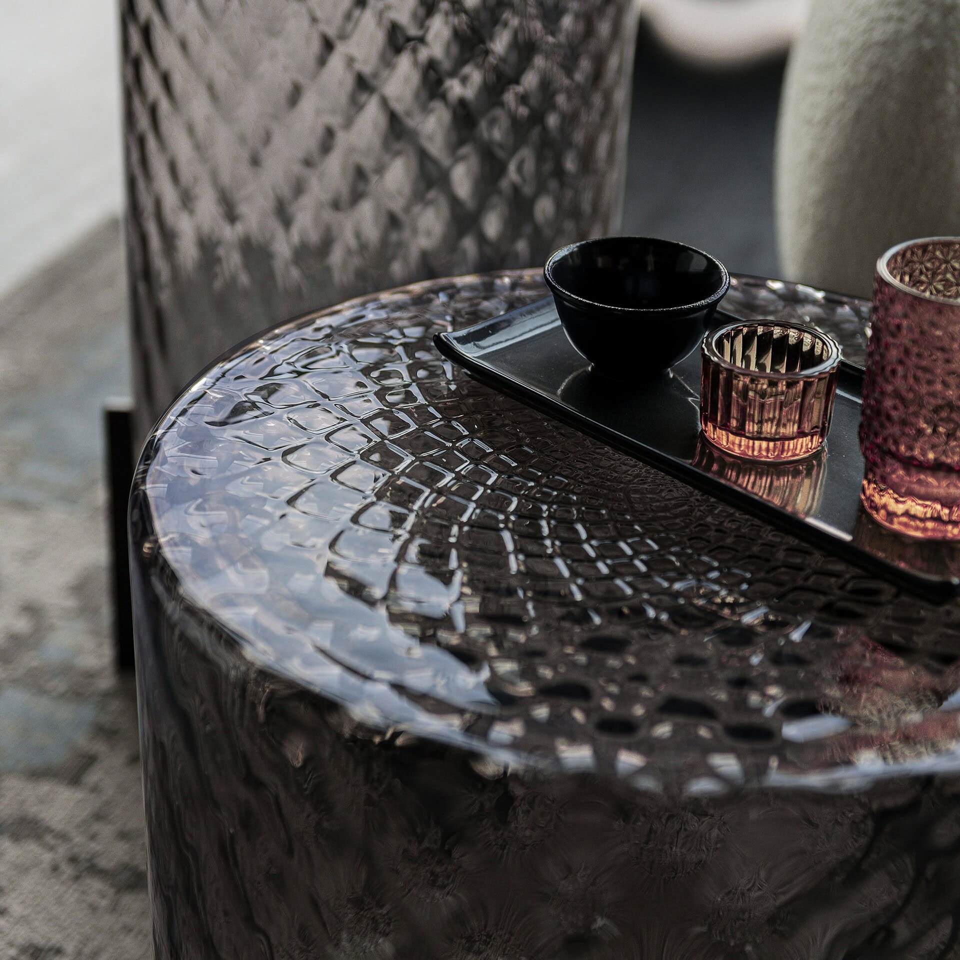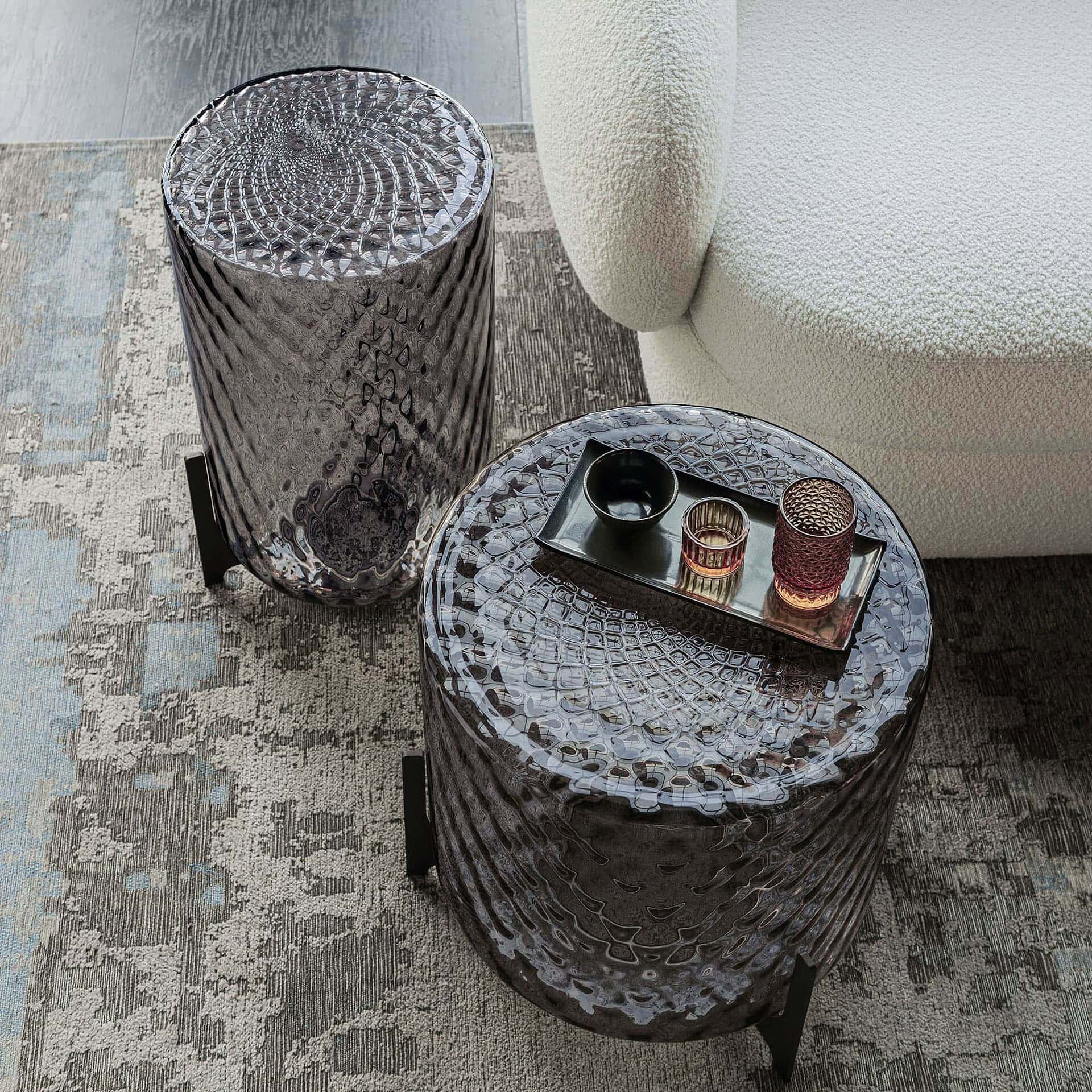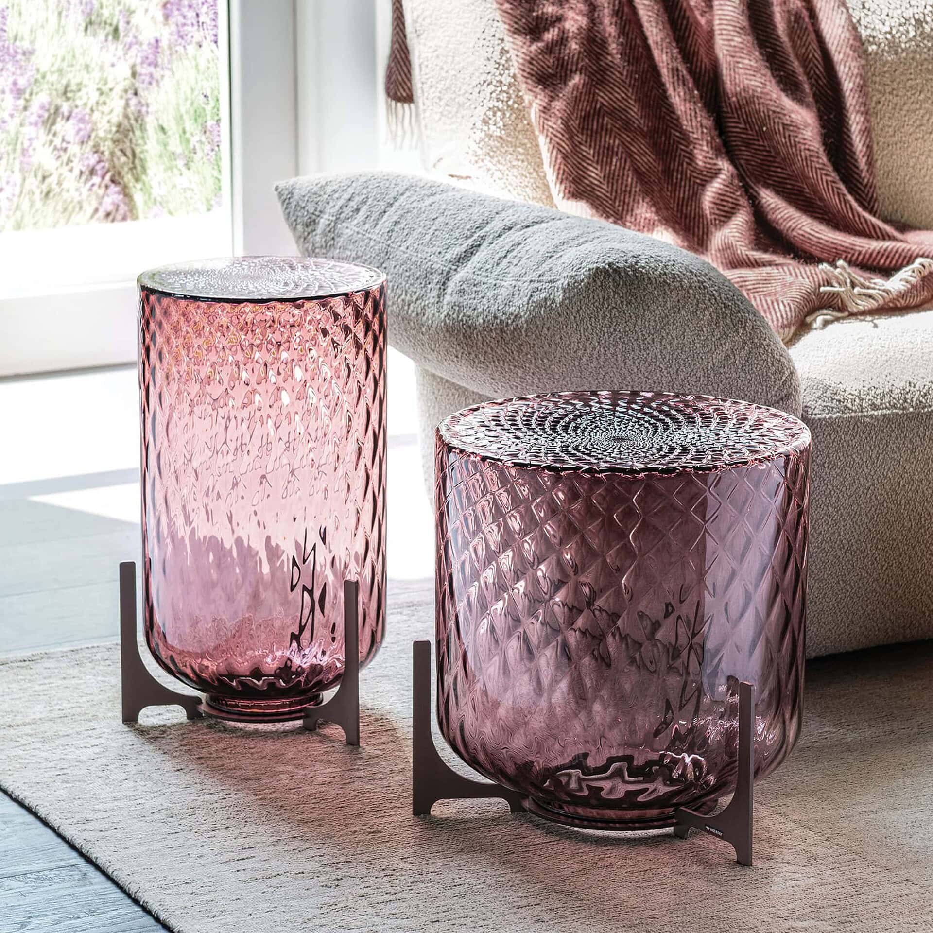 The base is crafted in embossed bronze lacquered steel (GFM18), while the sculptural frame is made from artistic decorated glass in Fumé, Verde Pavone, or Melanzana.