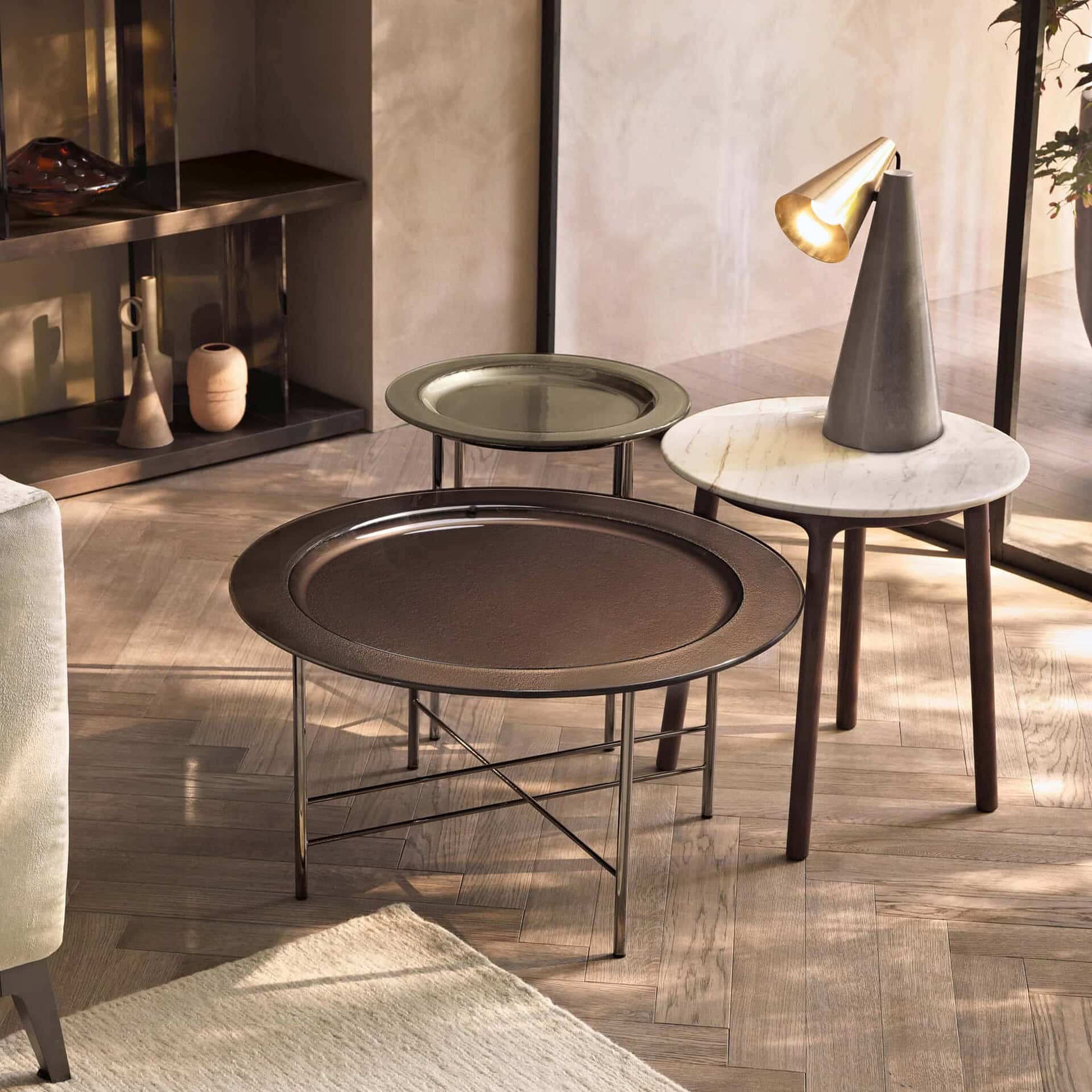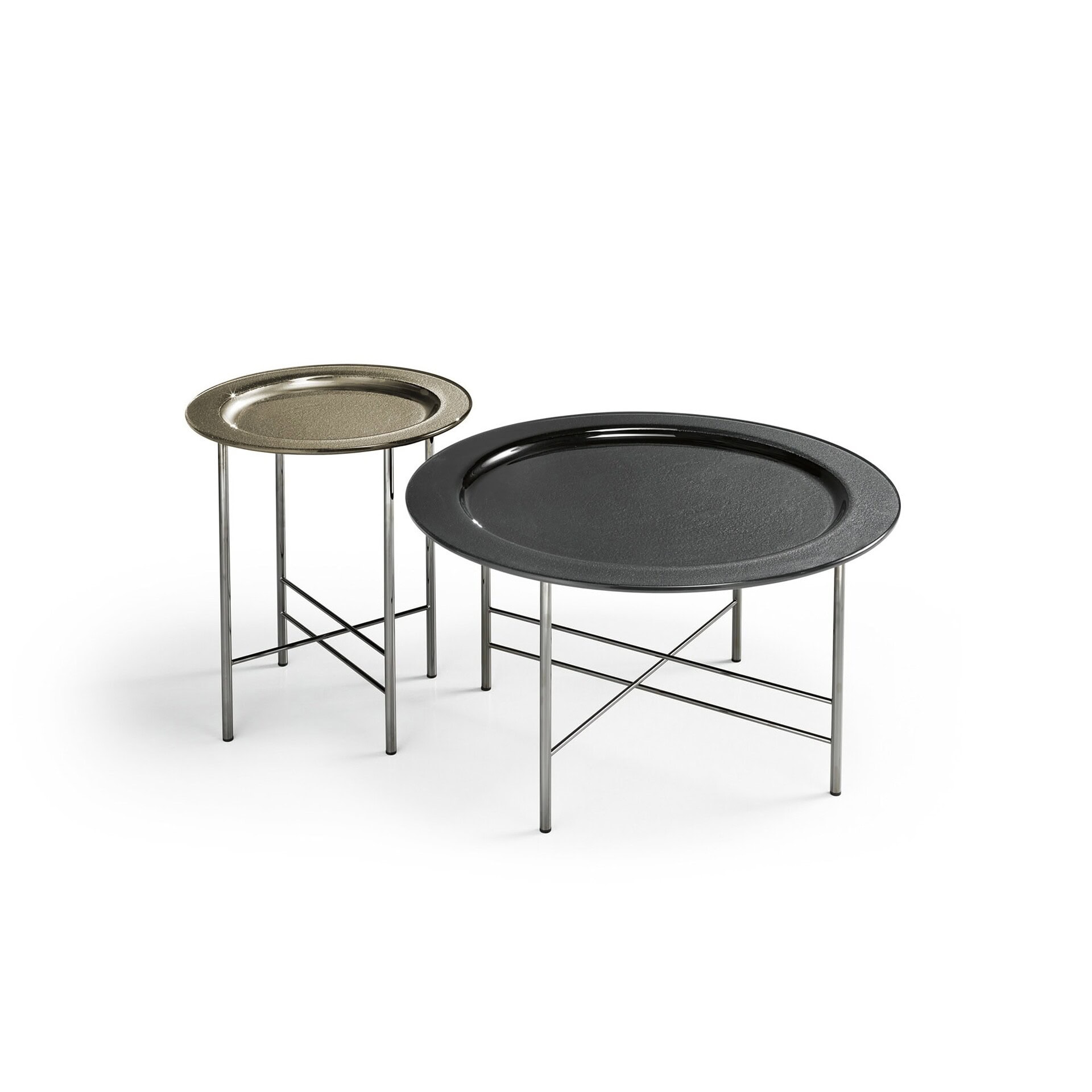 Crafted in three available sizes, En features a 10 mm fused glass top that is back-painted in brilliant metallic hues. The table rests on a sleek metal base finished in Black Glossy Nickel, which contrasts beautifully with the shimmering surface. Each size offers a distinct presence, allowing it to function alone or in curated groupings for added impact.