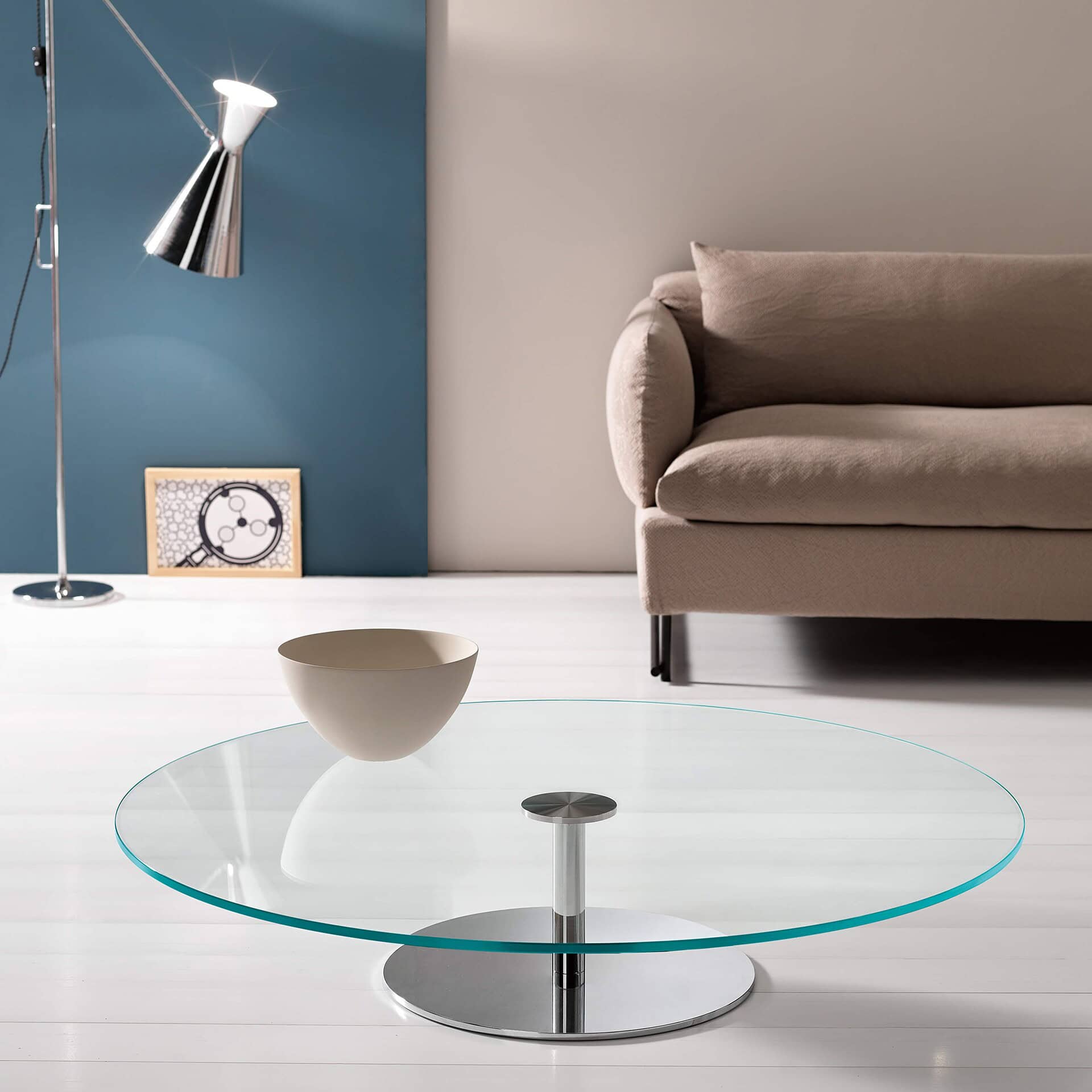 Shimmering lights and three-dimensional effects, thanks to the base and legs in mirrored chrome, make this coffee table very special and desirable. The Farniente Low Table is available with a top in clear, extra-clear or smoked tempered glass, ideal for luxurious settings, and come with three versions of the base: round, rectangular, square base and top.