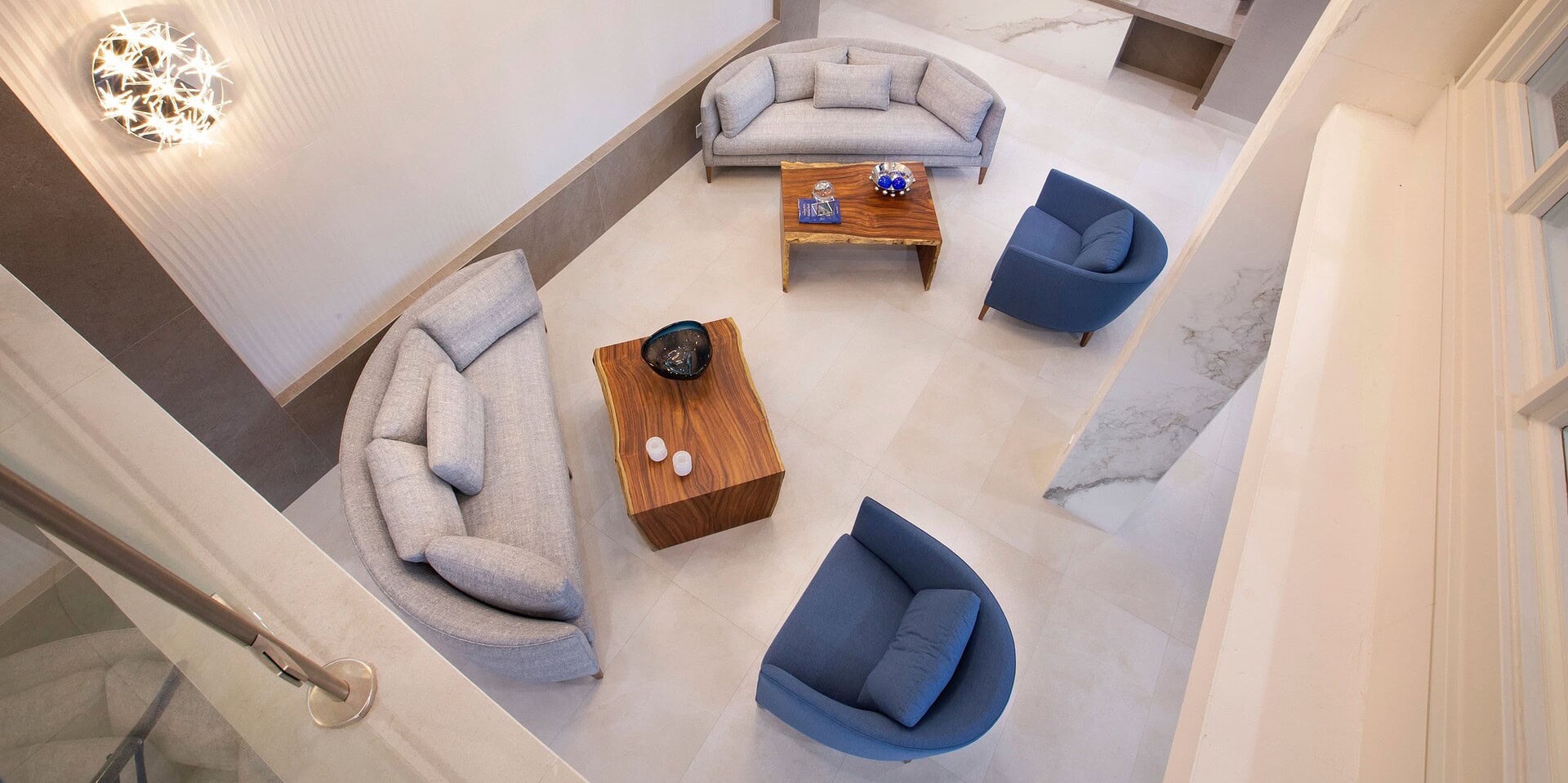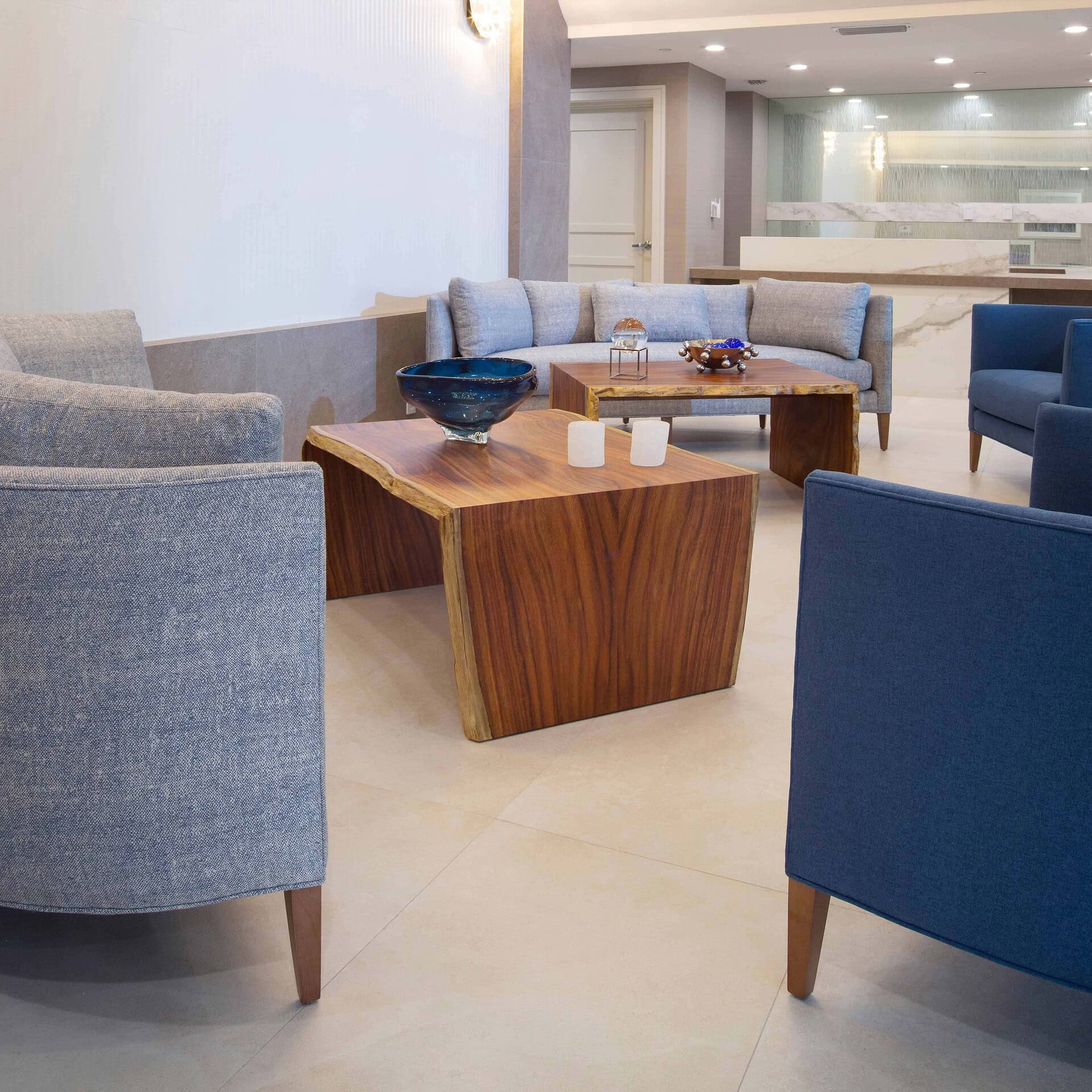 This coffee table is a perfect example of how we like to embrace the natural quality of wood and celebrate it! We continue the grain through this waterfall edge created a continuous flow to the floor.