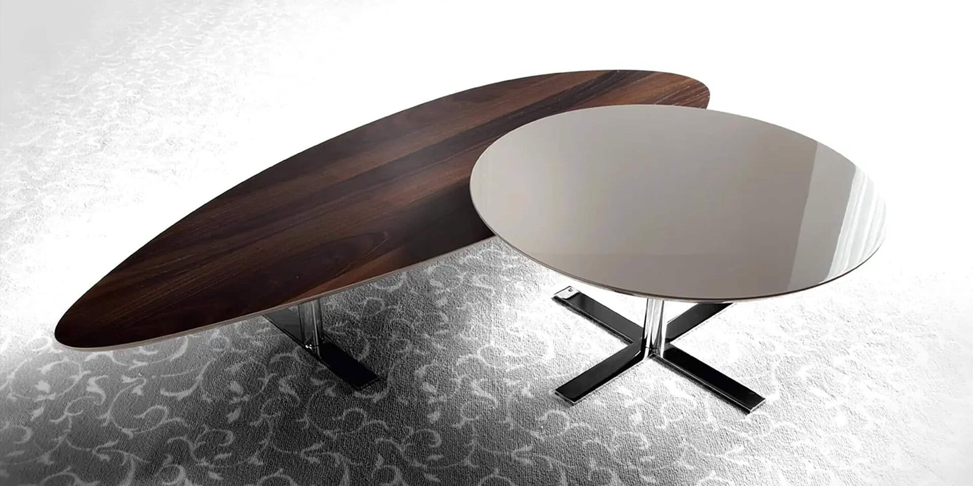 Elegant glass side tables with chrome bases for contemporary living spaces.