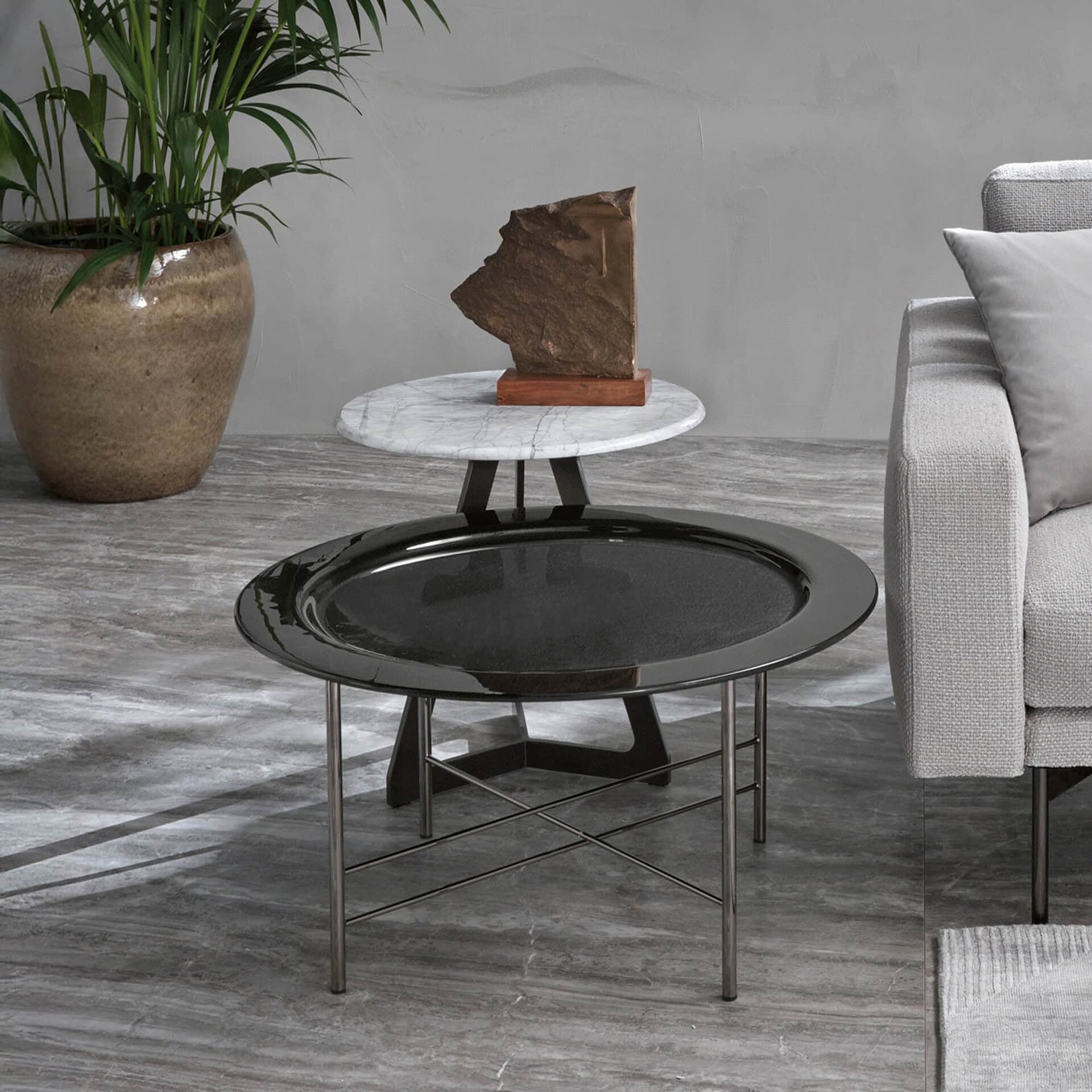 Each table in the Macramè collection is crafted with artisanal precision, offering a harmonious blend of transparency, depth, and material richness. The glass top, approximately 0.39 inches thick, is available in three refined finishes that pair with coordinated spun-glass bases. Offered in four versatile sizes, the Macramè table adapts effortlessly to living rooms, lounges, and layered coffee table compositions, serving as a functional centerpiece with sculptural presence.