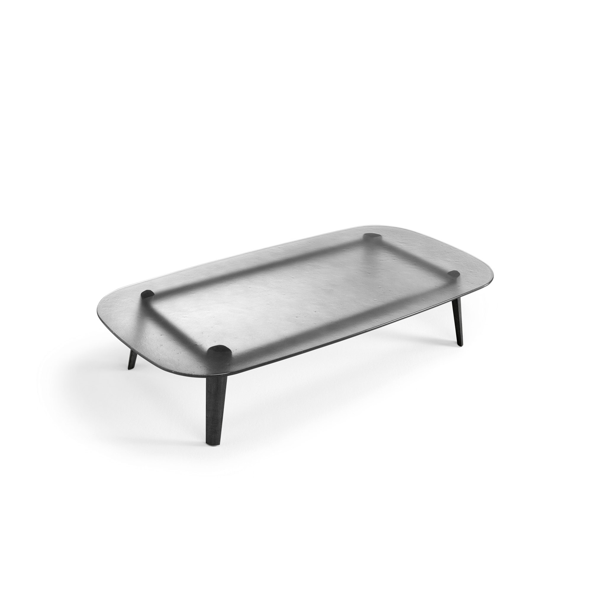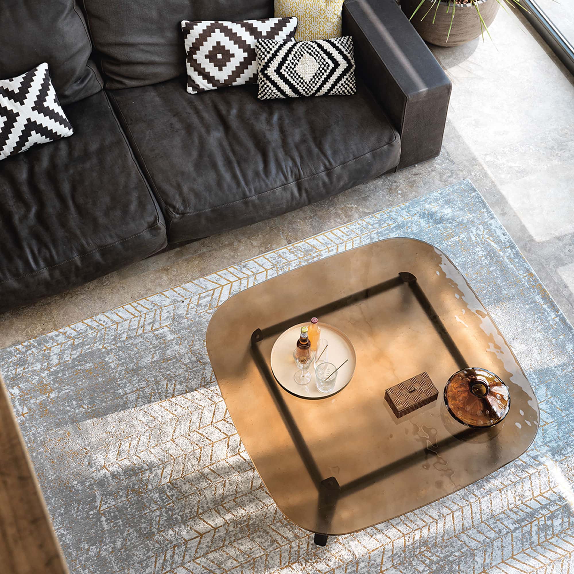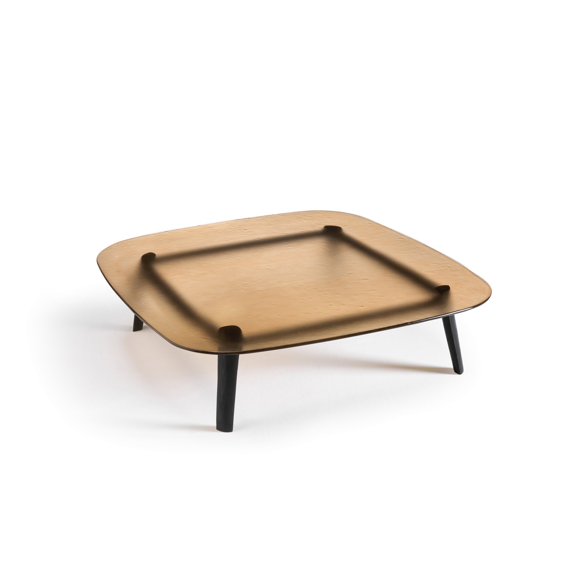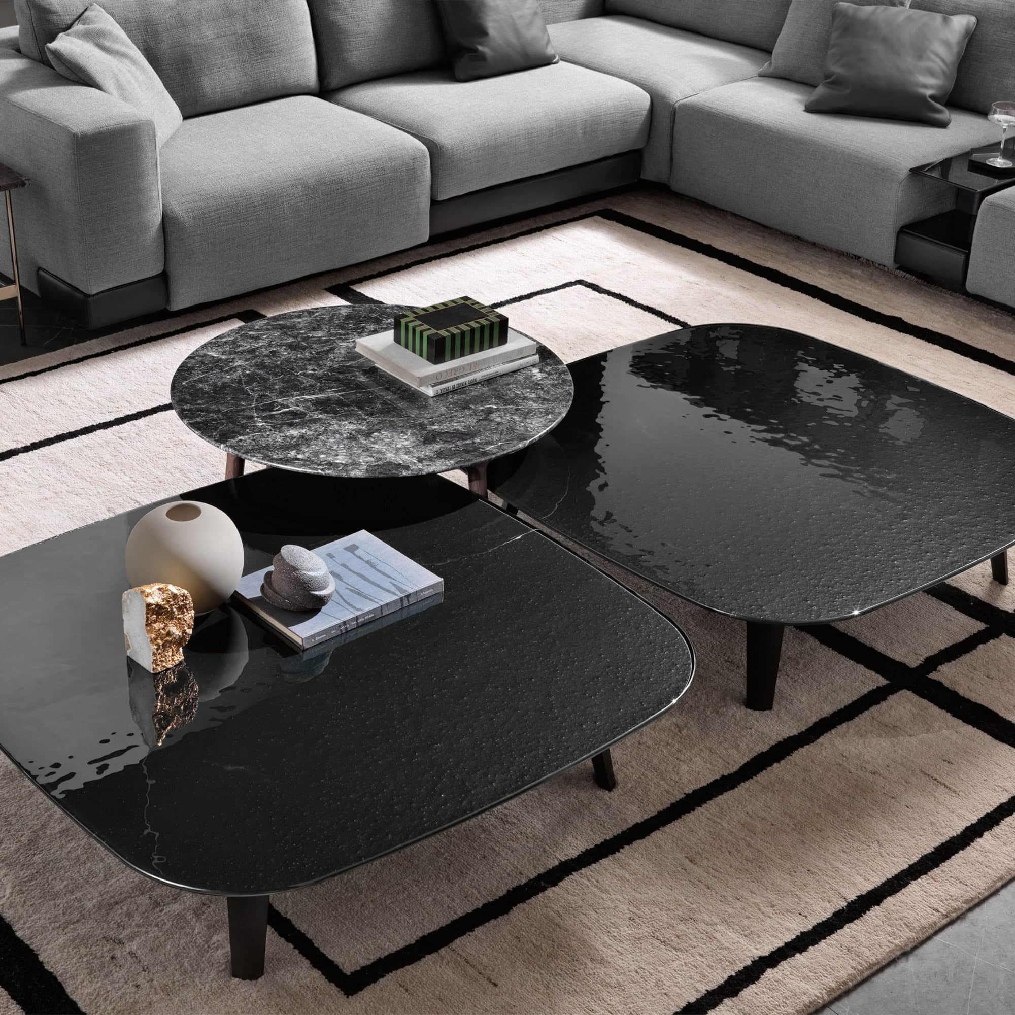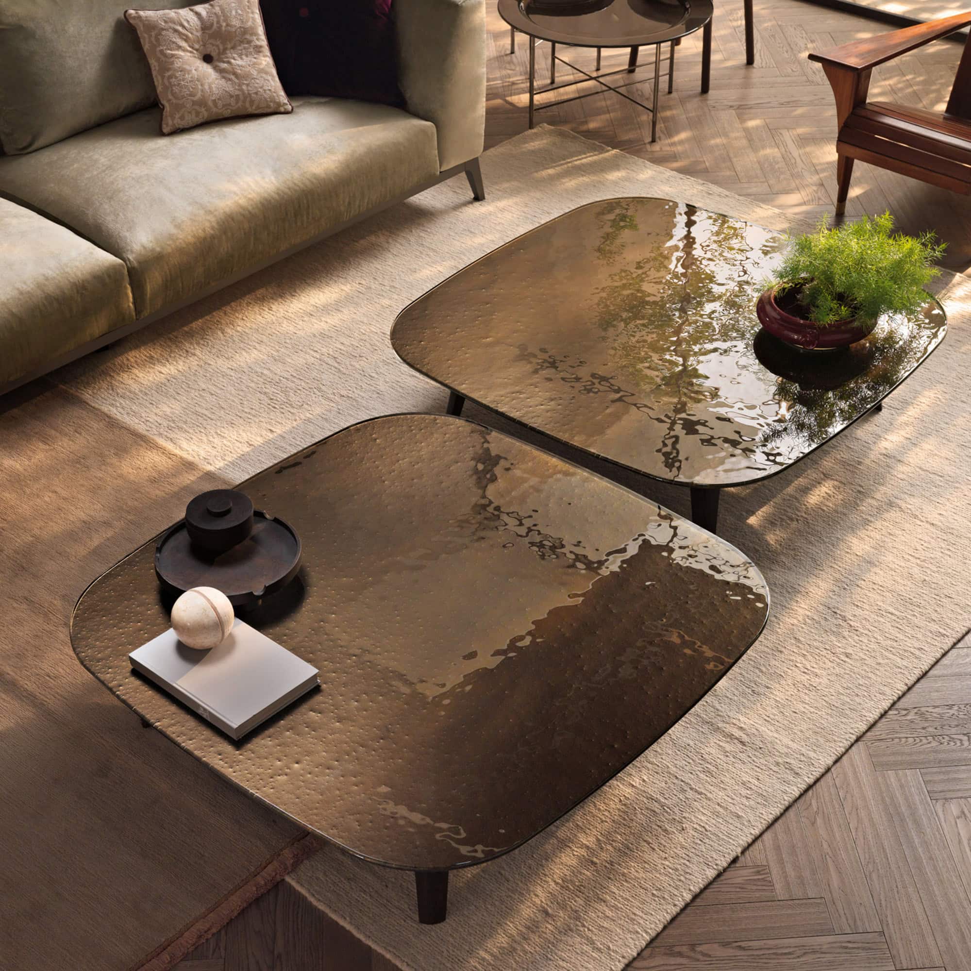 This coffee table is available in two sizes: 160 × 80 × 30 cm or 120 × 120 × 30 cm, each capable of supporting up to 50 kg. The solid wood base is offered in open-pore finishes of Tobacco or heat-treated Black. The top comes in back-painted fused glass with semi-transparent hues like Amber, Smoke, Blue, or Natural Satin, or in high-impact metallics like Brilliant Black or Brown. For those preferring stone, Cat.M1 marble options include Mystic Brown and Carnico Grey, while Cat.M2 features Calacatta Royal and Manhattan. Subtle surface variations emphasize the handcrafted nature of each table.