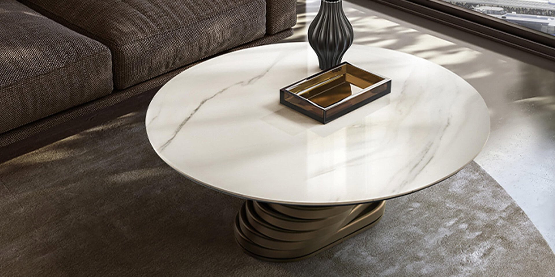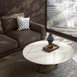 The Rotolo Low Coffee Table in ceramic stands out due to it's appealing and unique structure and design. With its futuristic base, in its crescendo of a material vortex, supports one side of the ceramic top and the lacquered structure. This coffee table features a round top in ceramic 16 mm thickness with 10 mm thick tempered glass.