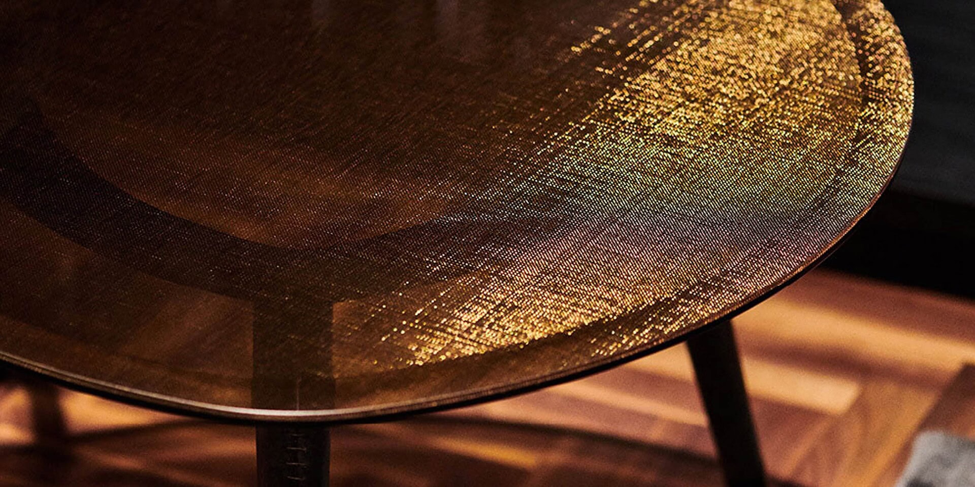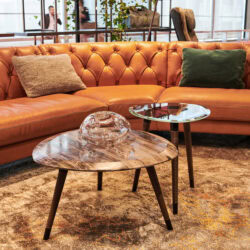 This serving table collection is remarkable and told through its materials and details: tempered glass (neutral or with metal grid) and natural stones for the top, hand-stitched leather and lacquered ash for the legs. The perfect balance of refined design.