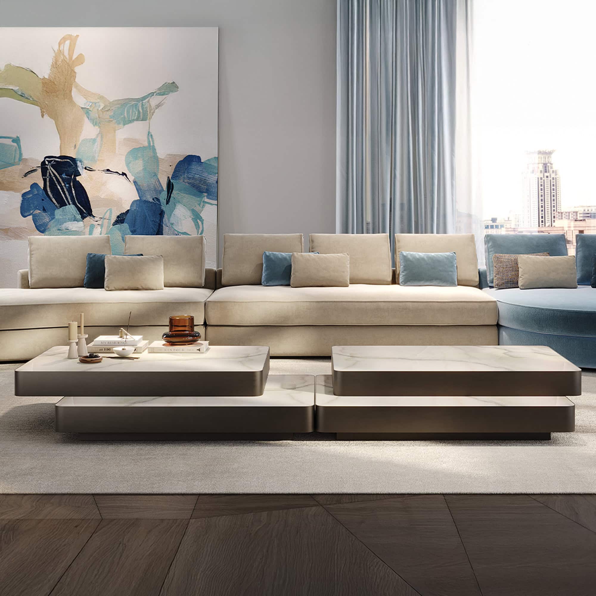 The Slide 40 Double-Top Coffee Table introduces a refined, architectural presence defined by layered geometry and elegant materiality. A fixed base top pairs with a sliding upper surface, creating dynamic compositions that expand or contract to suit the spatial need. The refined interplay of volumes is accentuated by its slim profile and luxurious metal finishes, giving Slide 40 a contemporary character that feels both sculptural and functional.