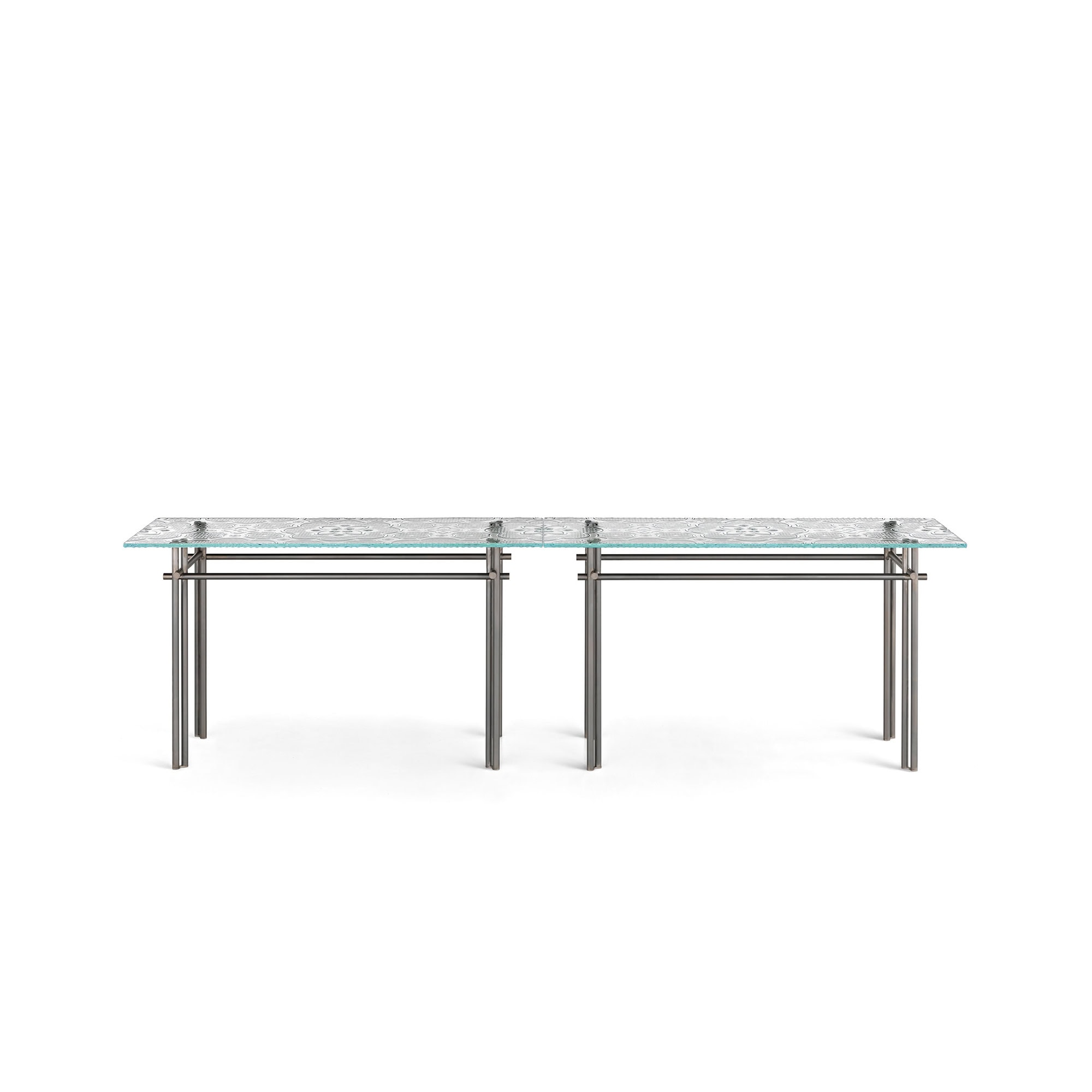 This registered design is available with a 15 mm thick glass top, either in clear extralight or back-painted with Cat.2 metallic finishes. For added luxury, the Cristaline also comes with a 20 mm thick marble top in select Cat.M1 and Cat.M2 finishes. Its base is constructed in metal and offered in Opaque Titanium or Black Glossy Nickel, designed to complement every version with visual harmony.