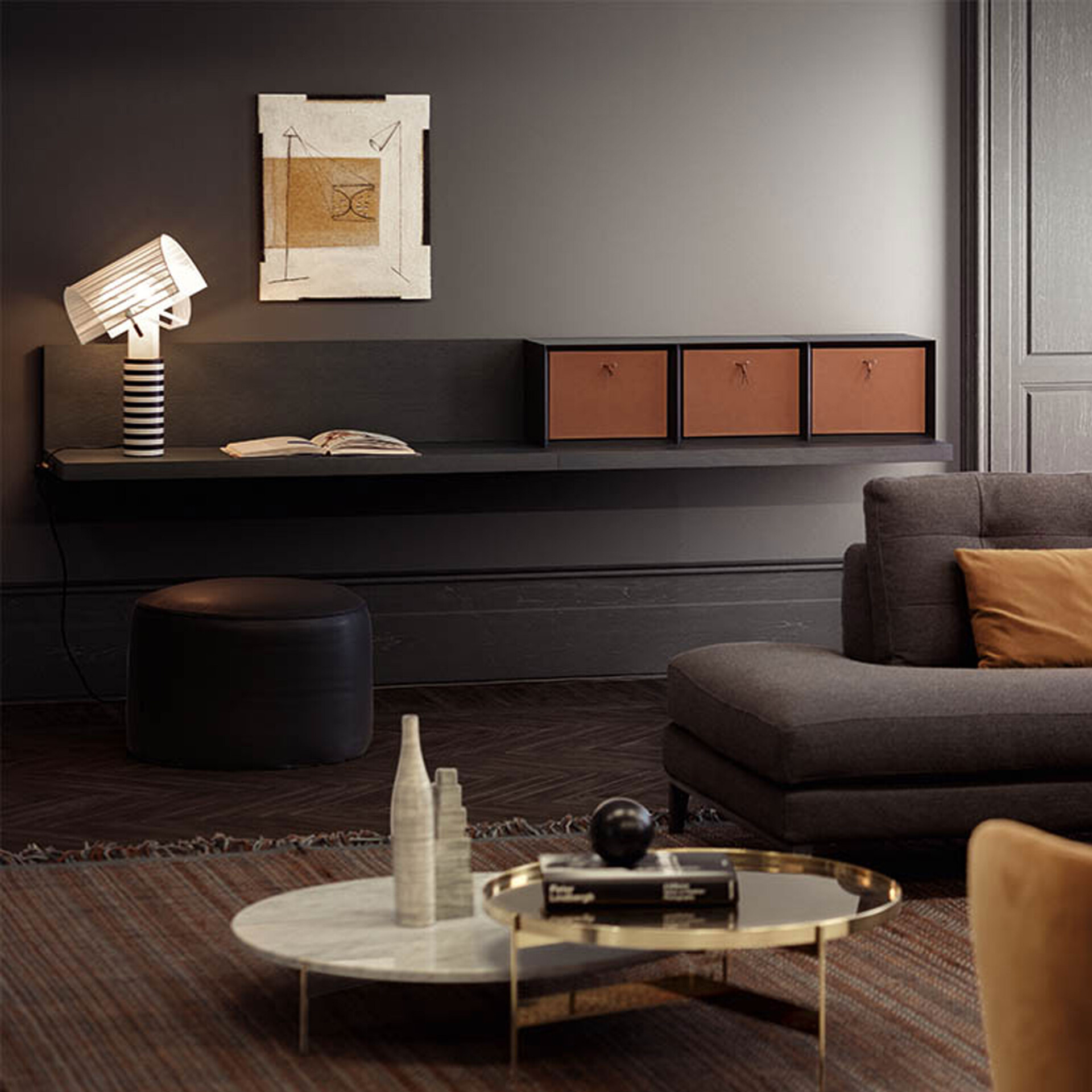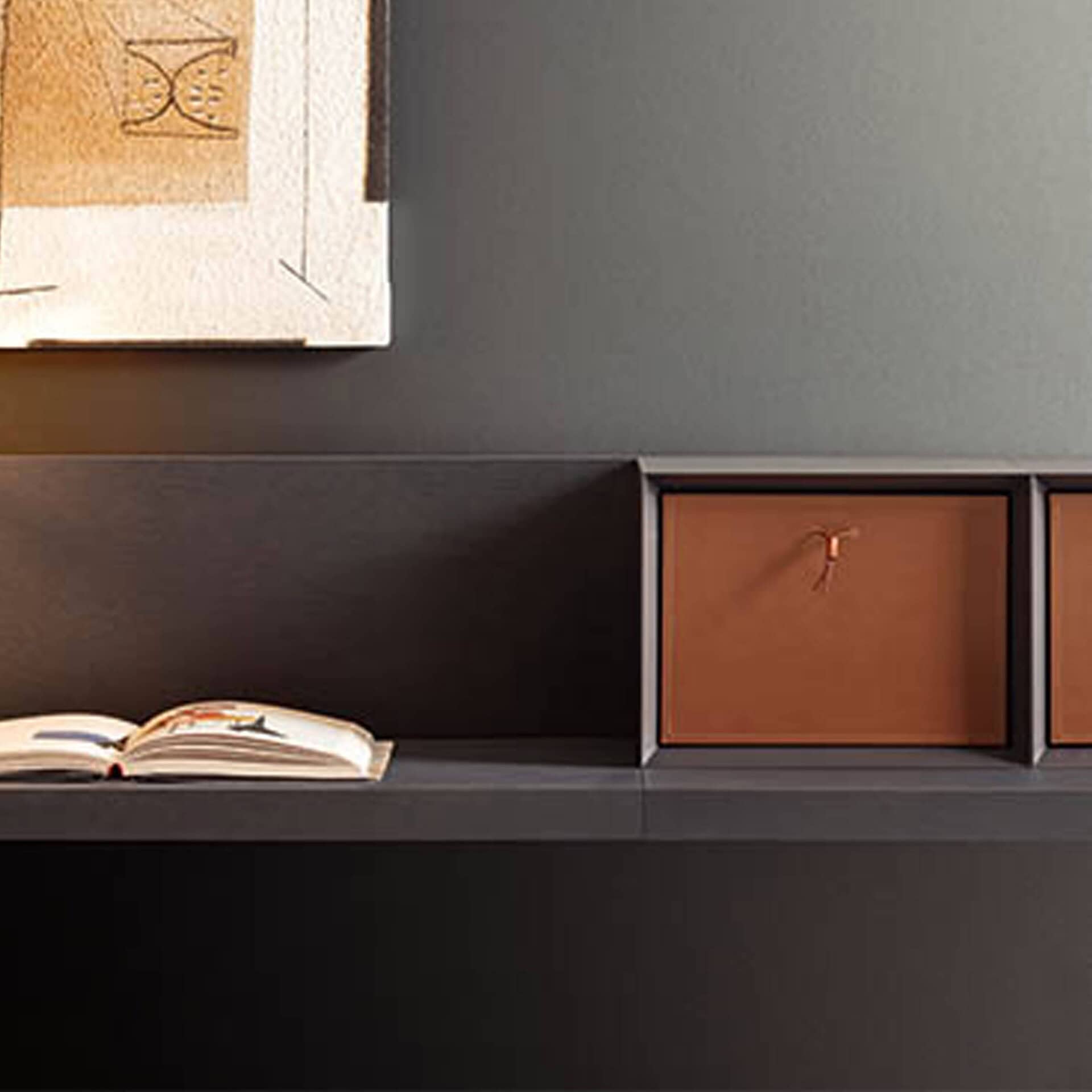Elle is a suspended wooden desk with a variety of finishes and colors to choose from, including Pianca materico, wood, and lacquer. As well as string and perimeter stitching in the same finish, you can also include hard leather boxes for open modules.