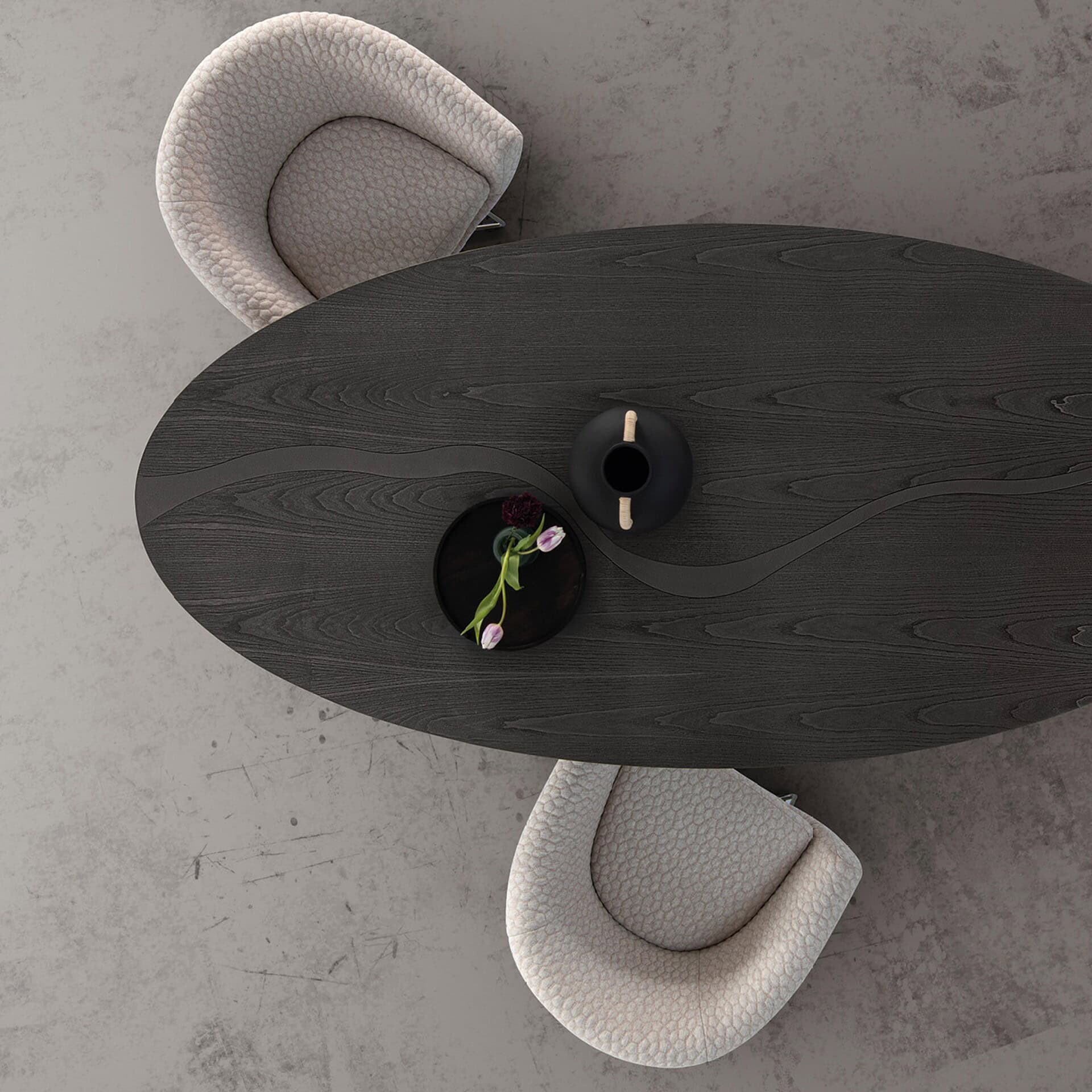 The Academia Dining Table is offered in a variety of high quality finishes. The unique piece is complimented with different colored burlwood inlays within the table top. With angular legs and metal supports, the dining table is an eye-catching statement piece.