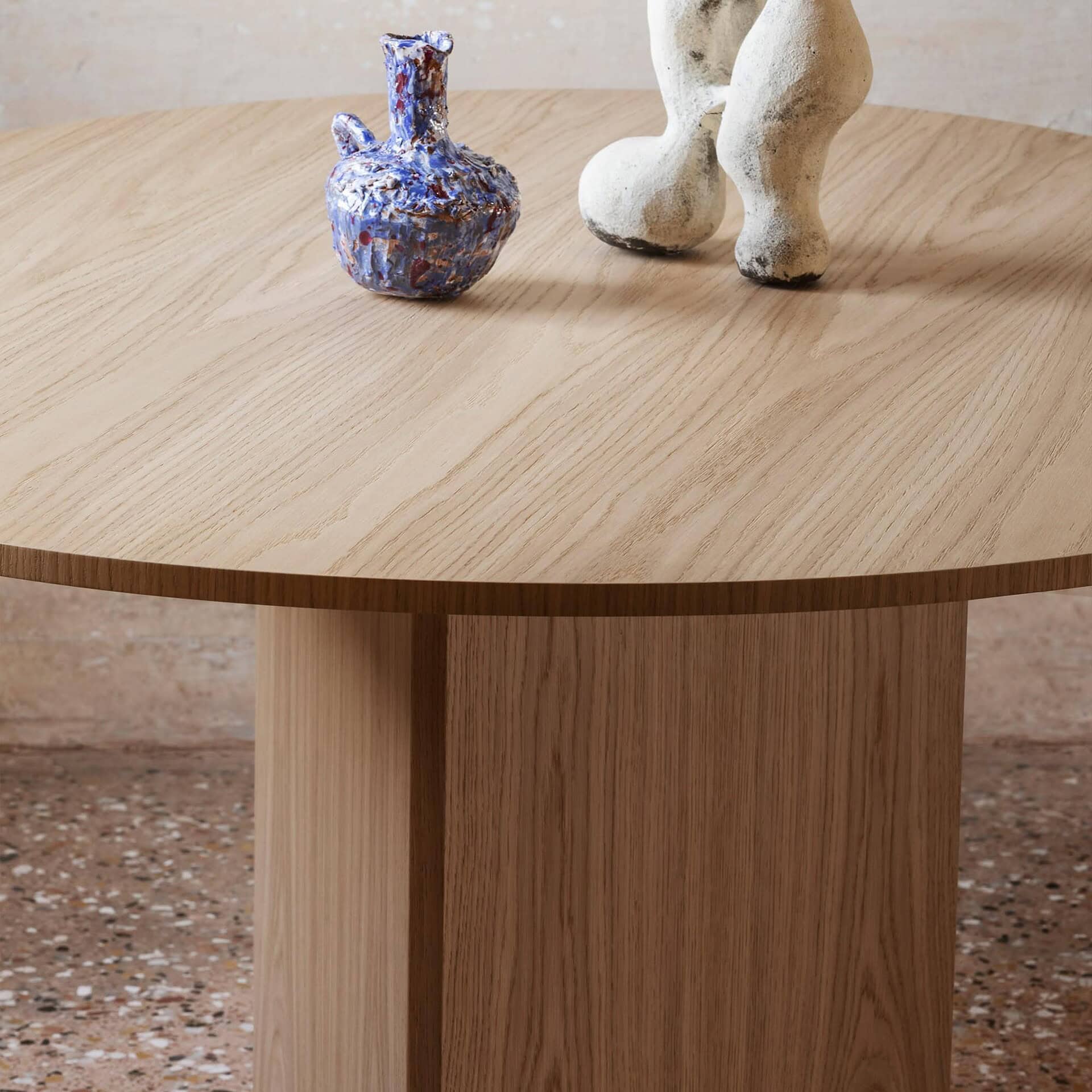 Top available in Travertine, Flamed Oak, Canaletto Walnut, Black Ash, or lacquered finishes in 13 NCS shades. Base available in matching Travertine, wood, or lacquer options.